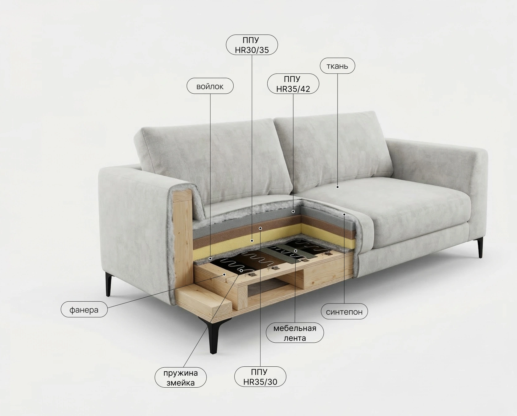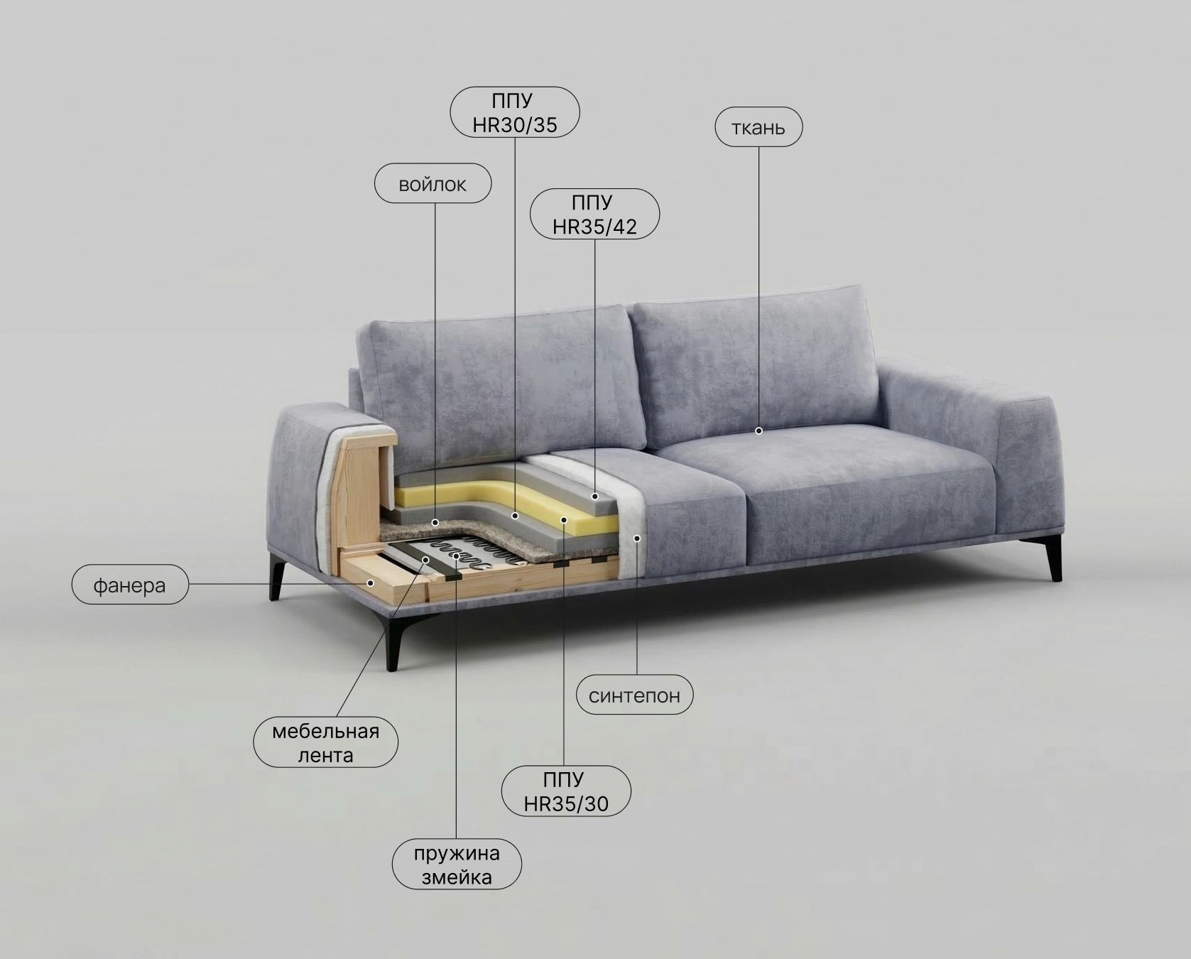 Прочная мебельная лента в основе сиденья. Создает гибкую, дышащую и исключительно долговечную основу для наполнителей. Предотвращает продавливание и дискомфорт