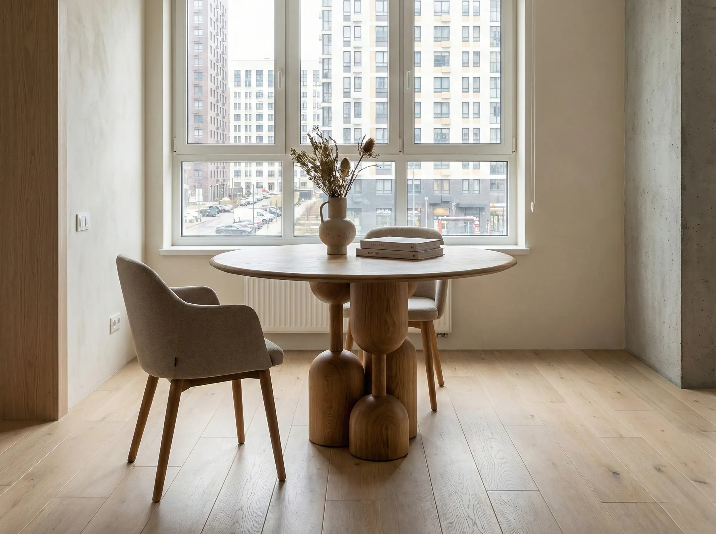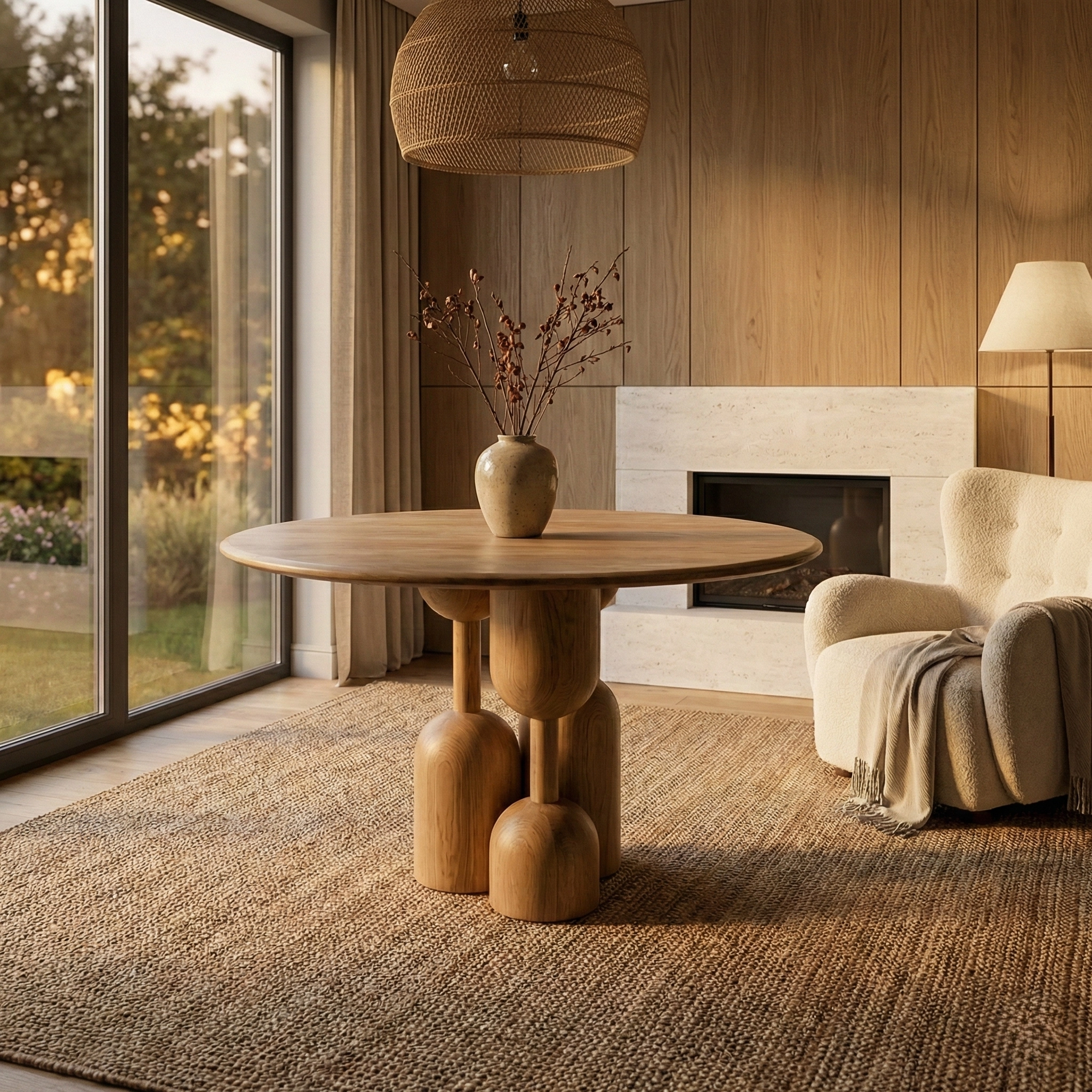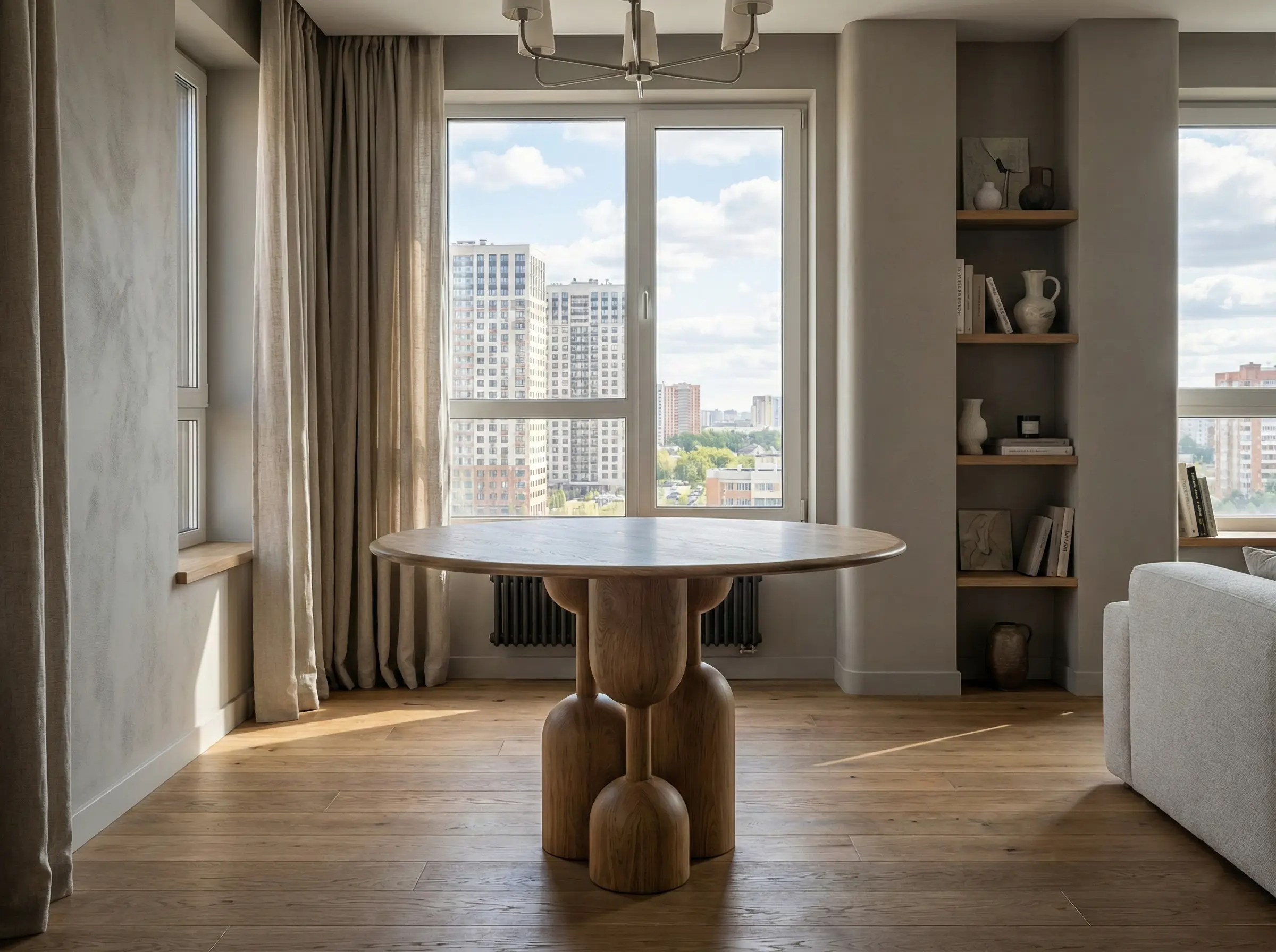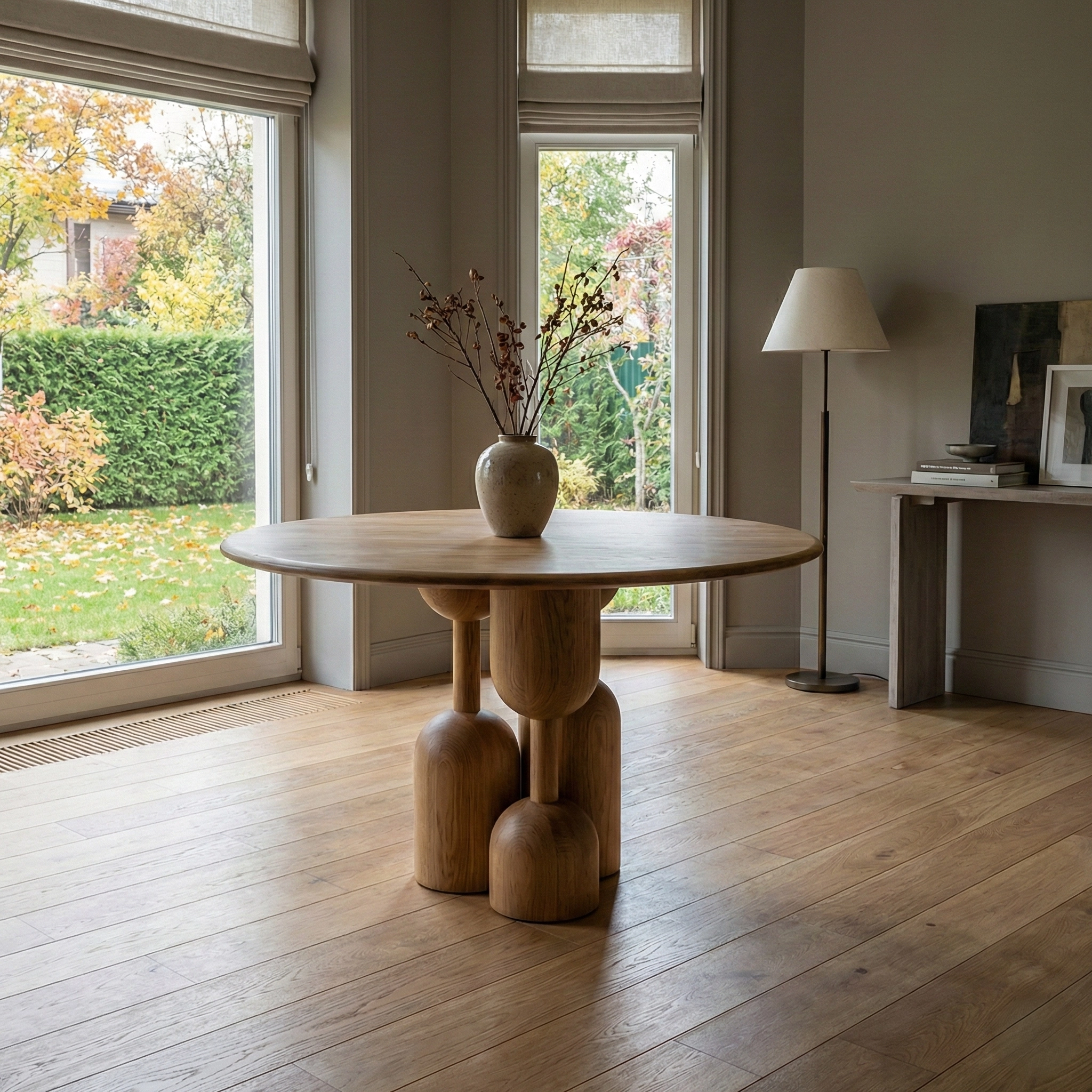 Стол из натурального дерева с пластичным скульптурным основанием, создающий выразительный акцент в жилых и общественных интерьерах
