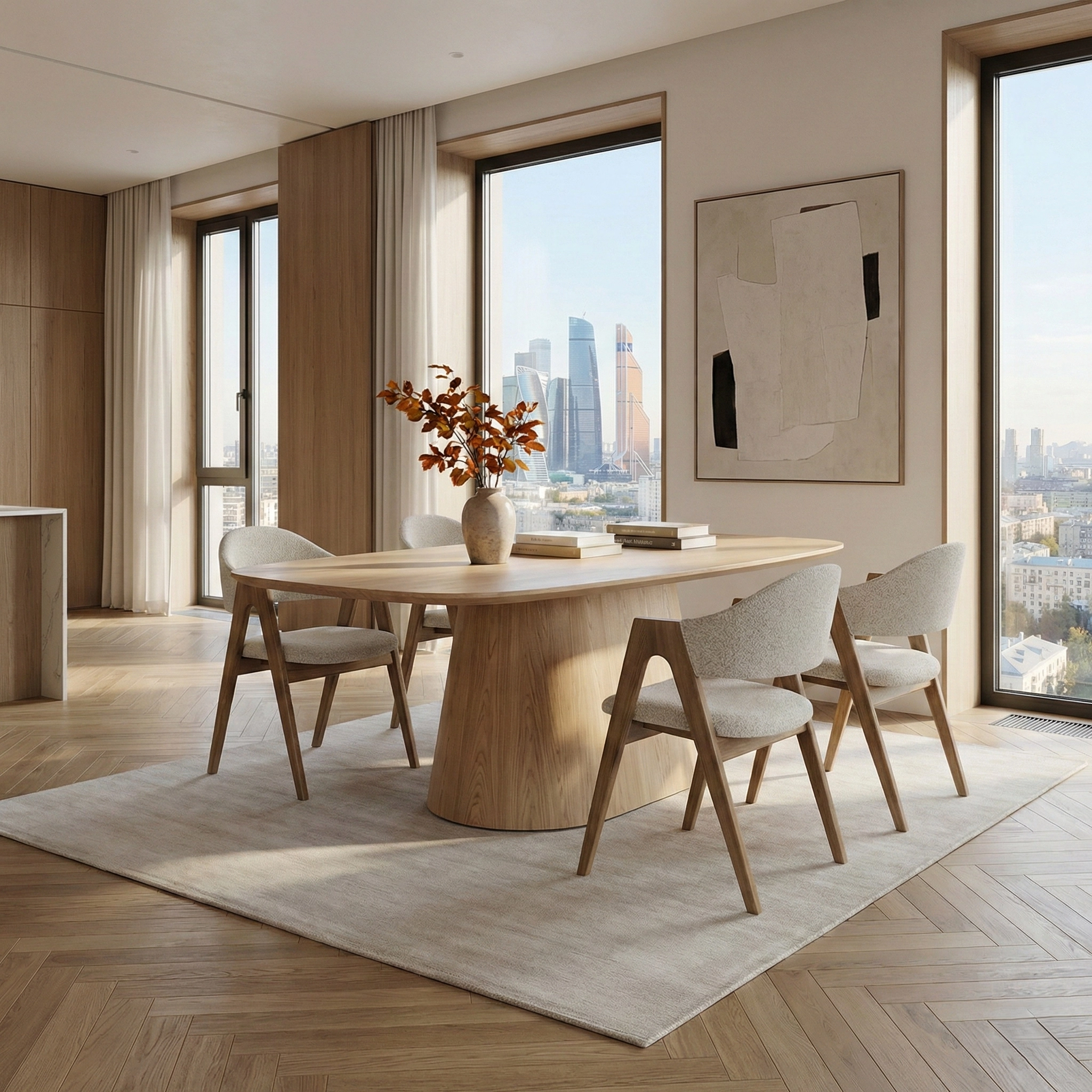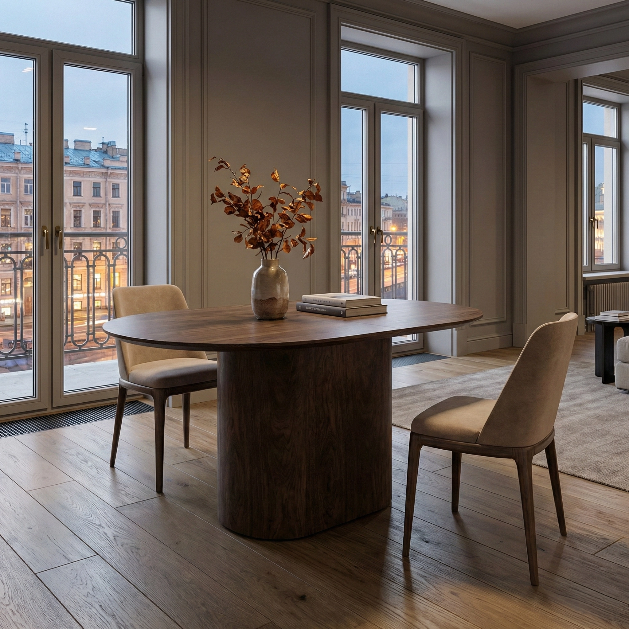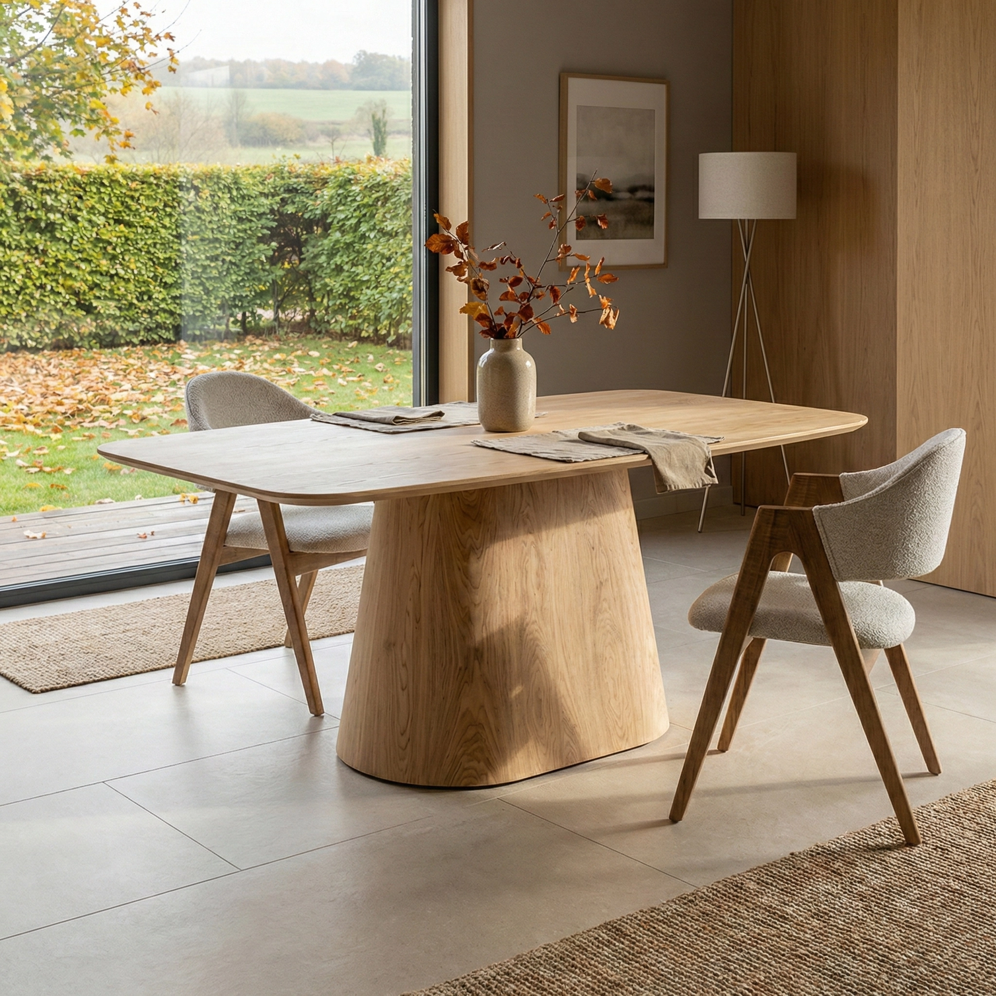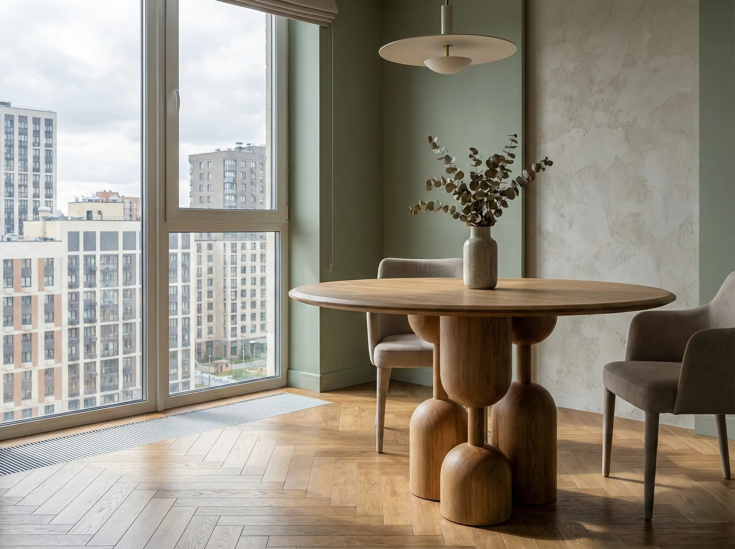 Стол из натурального дерева с пластичным скульптурным основанием, создающий выразительный акцент в жилых и общественных интерьерах