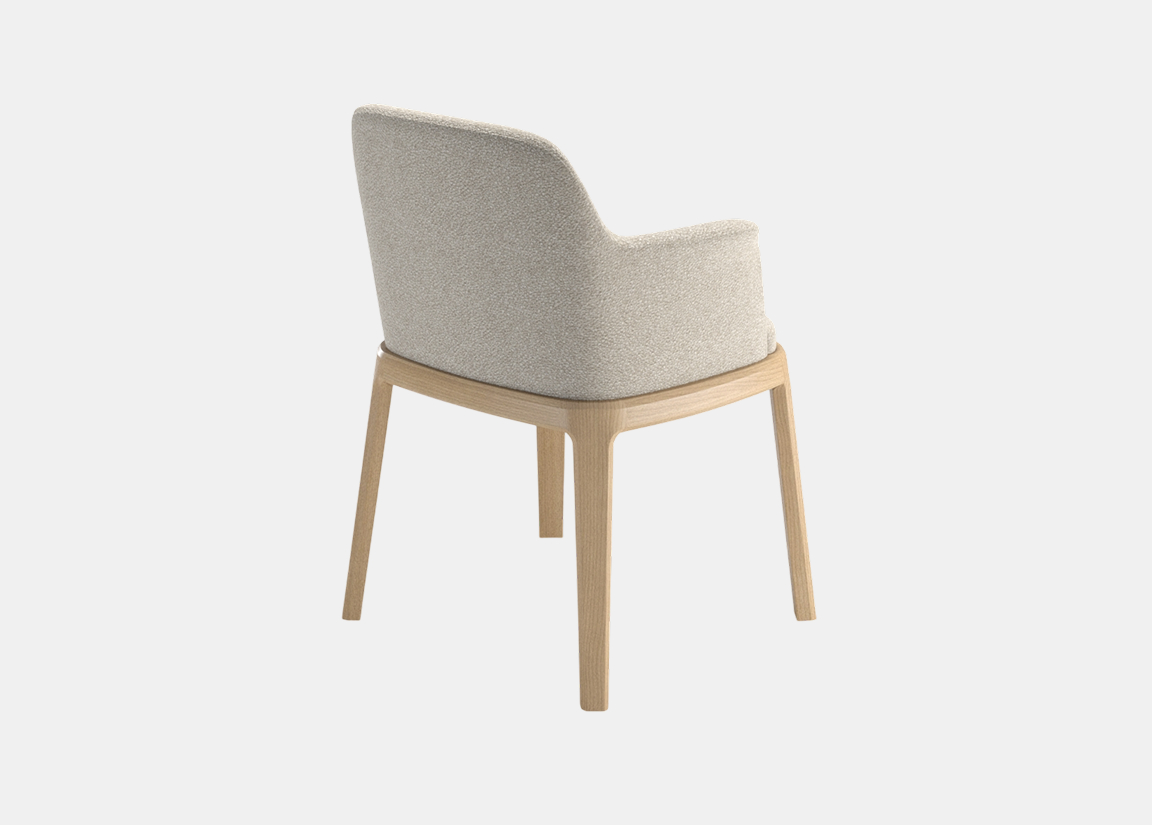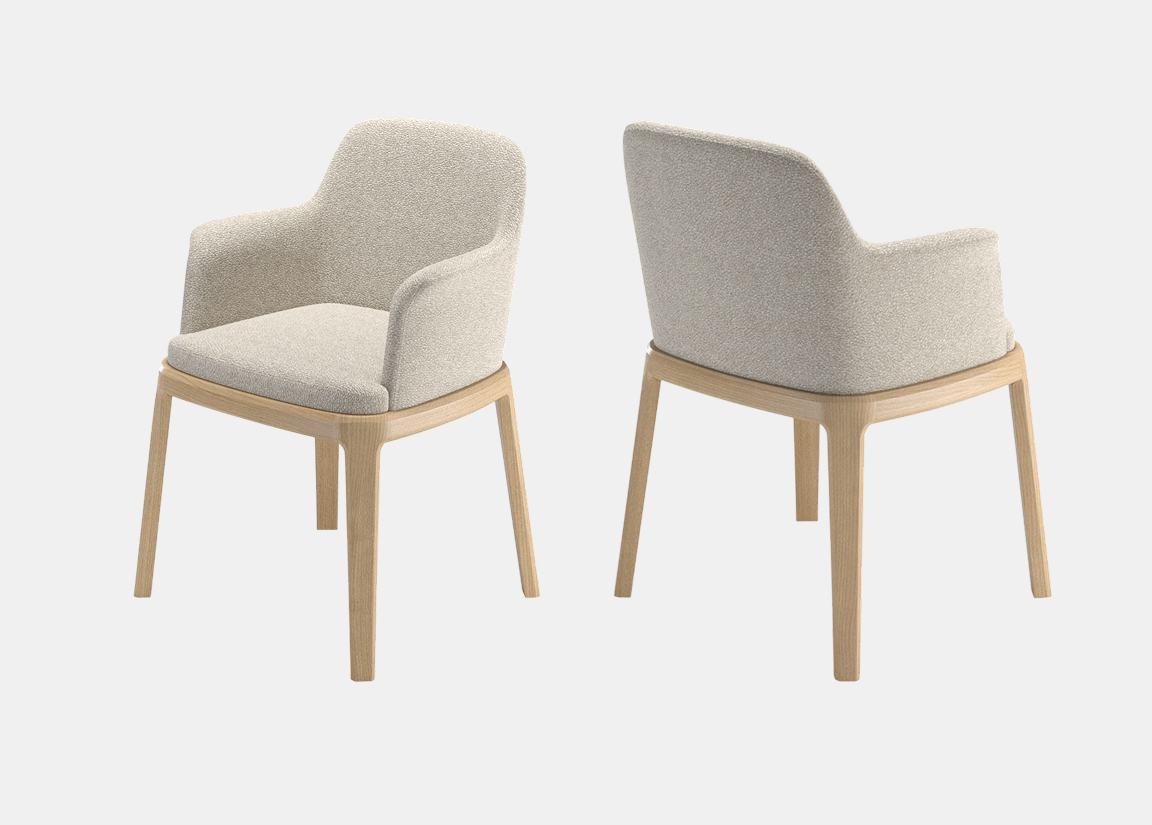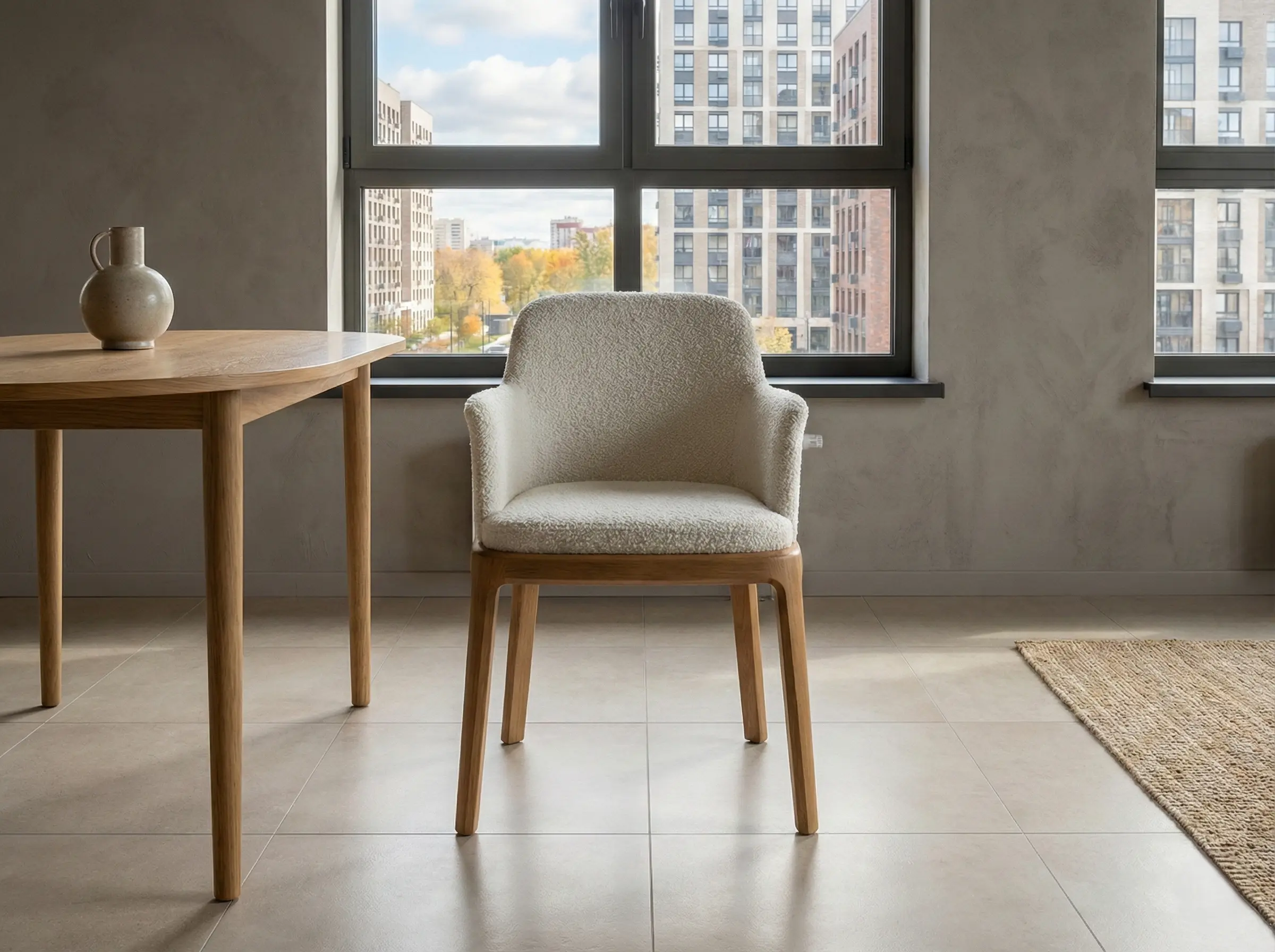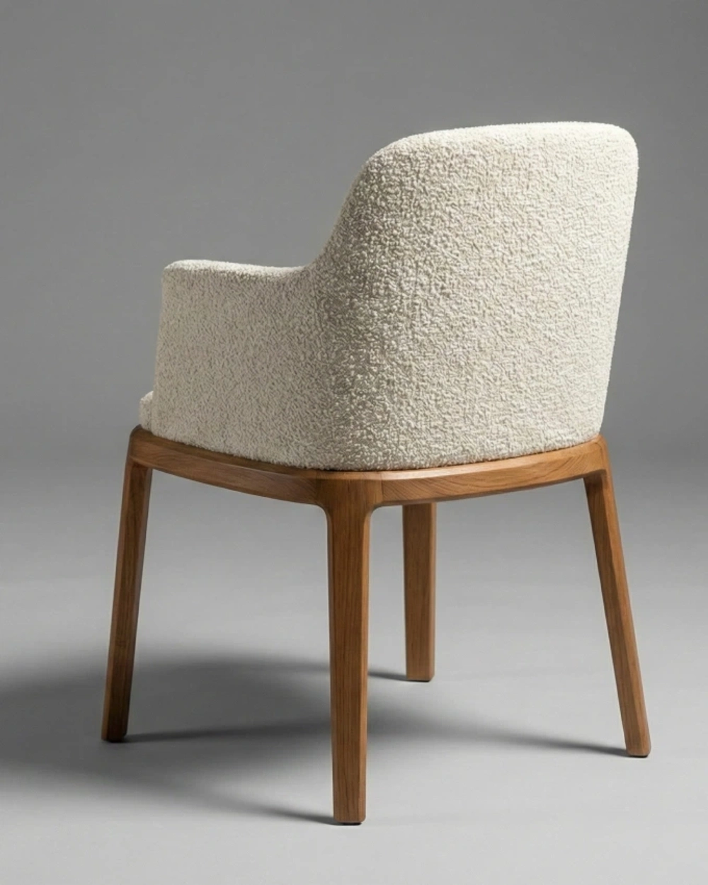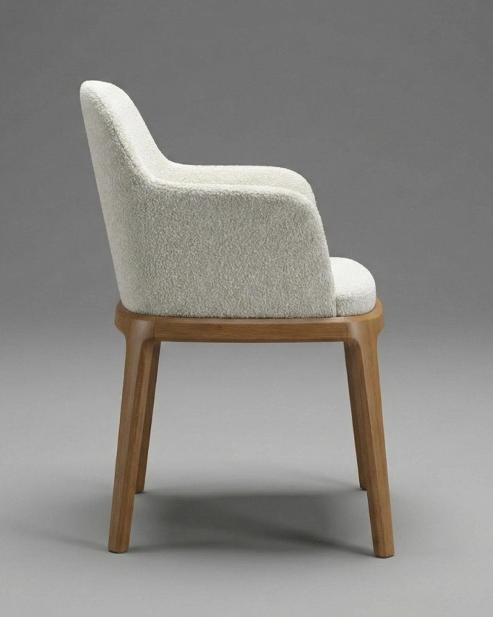 Стул с мягкой обволакивающей спинкой и текстурной обивкой на изящном деревянном основании, объединяющее комфорт и актуальную интерьерную эстетику
