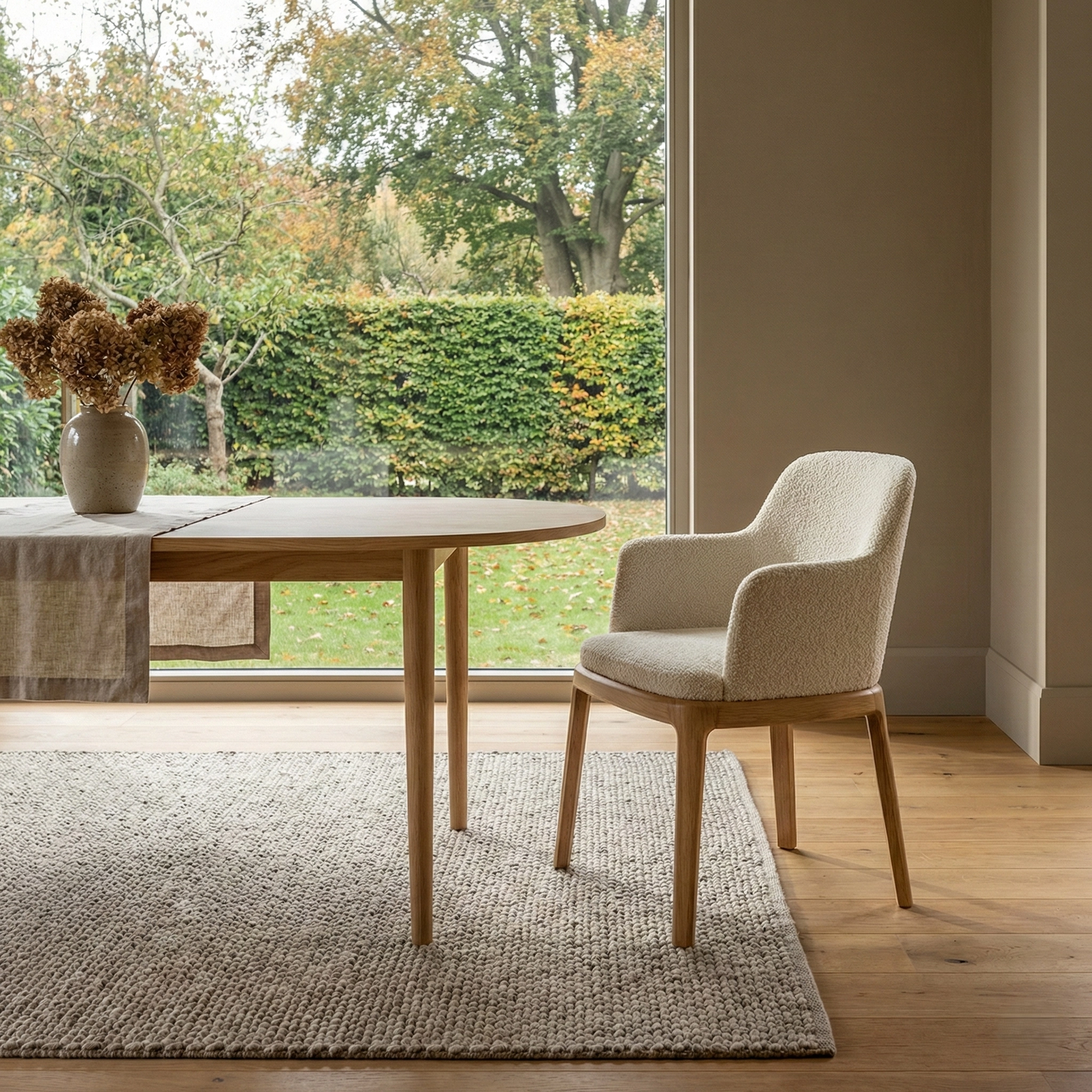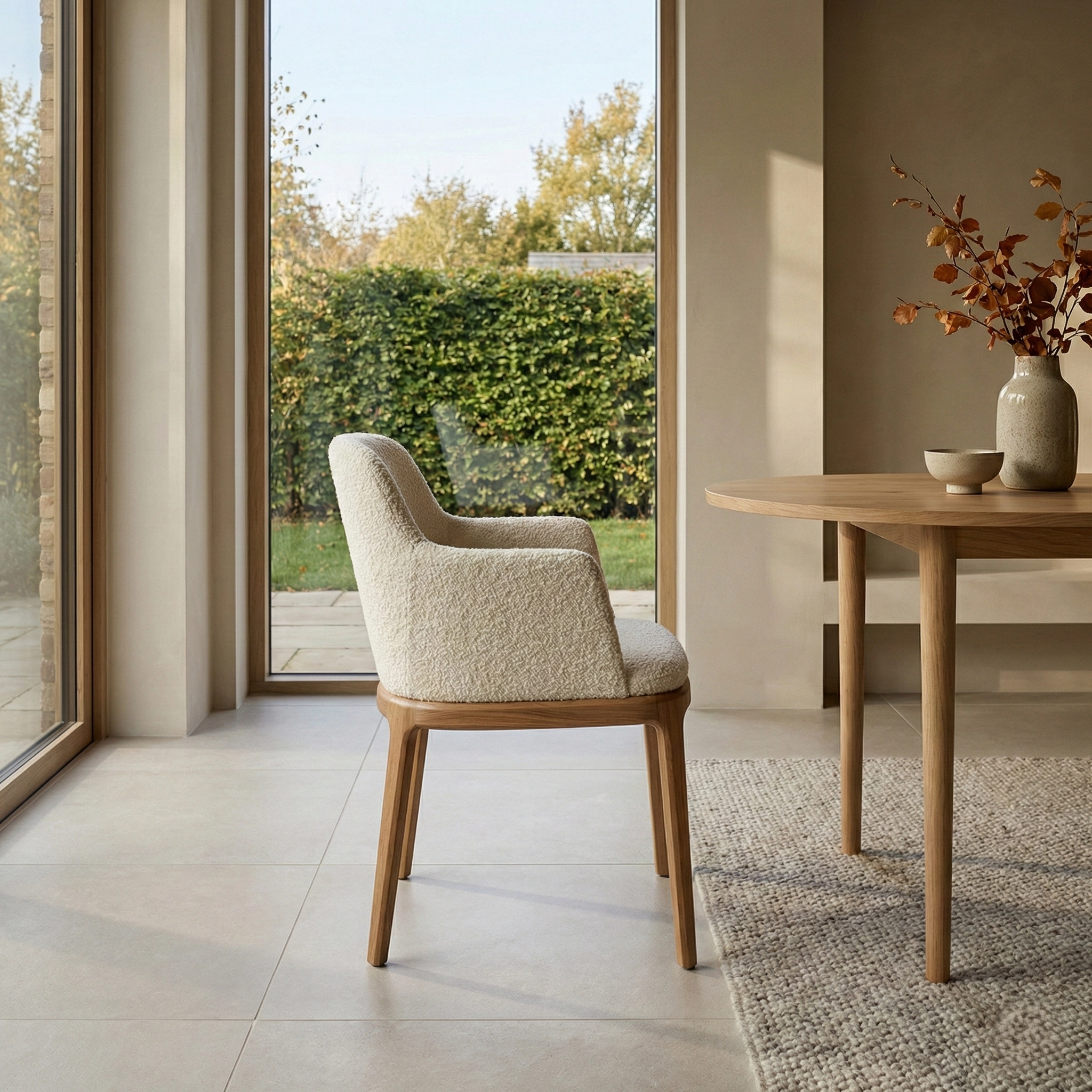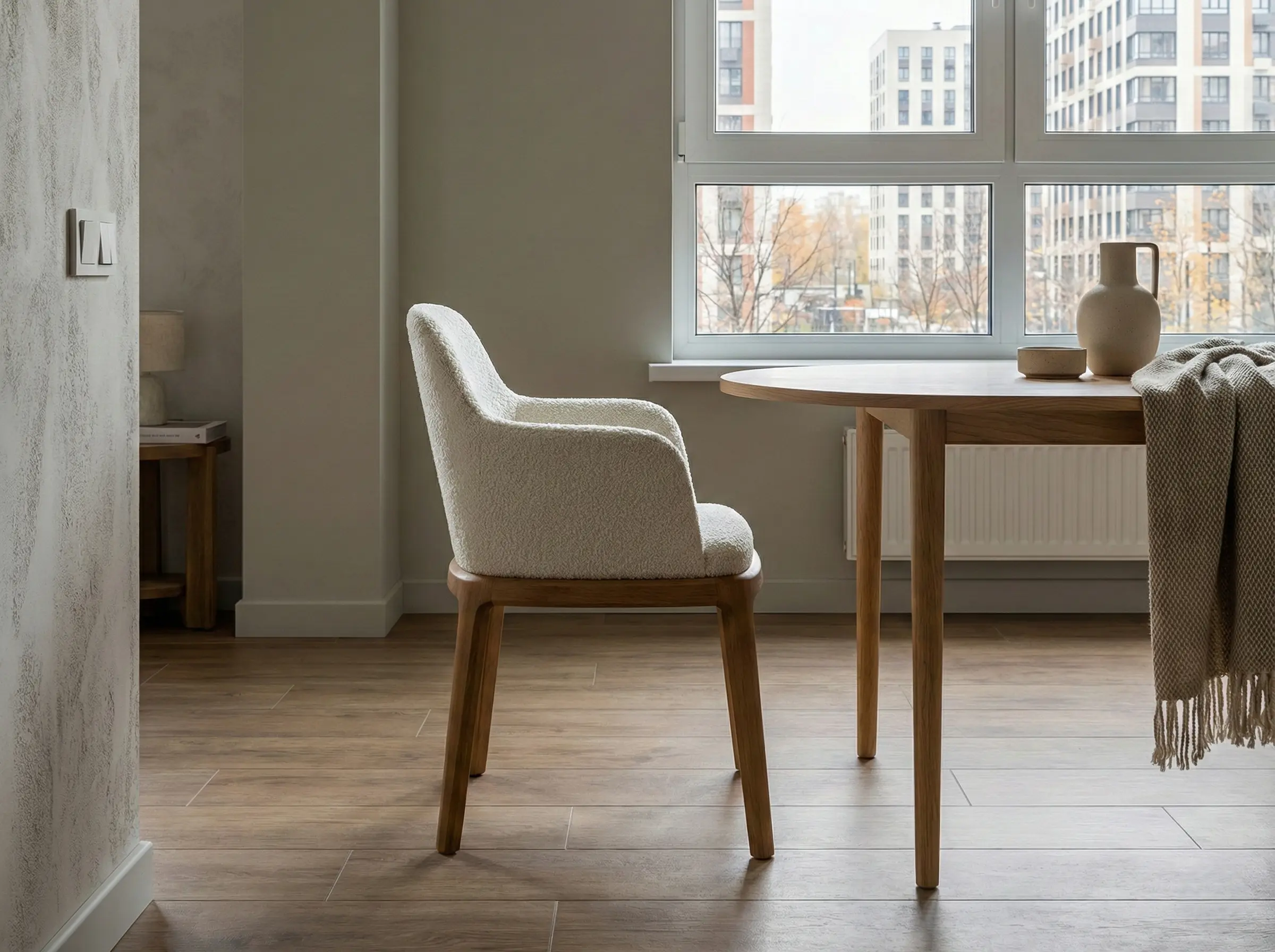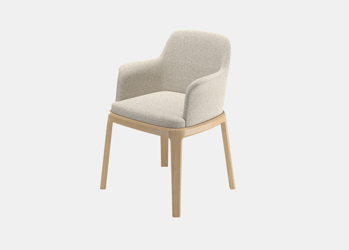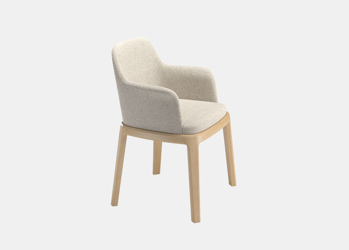 Стул с мягкой обволакивающей спинкой и текстурной обивкой на изящном деревянном основании, объединяющее комфорт и актуальную интерьерную эстетику