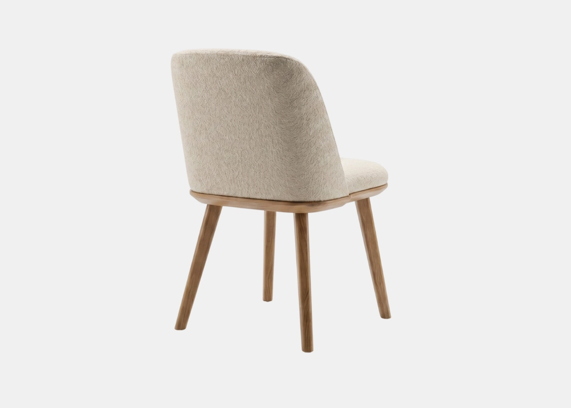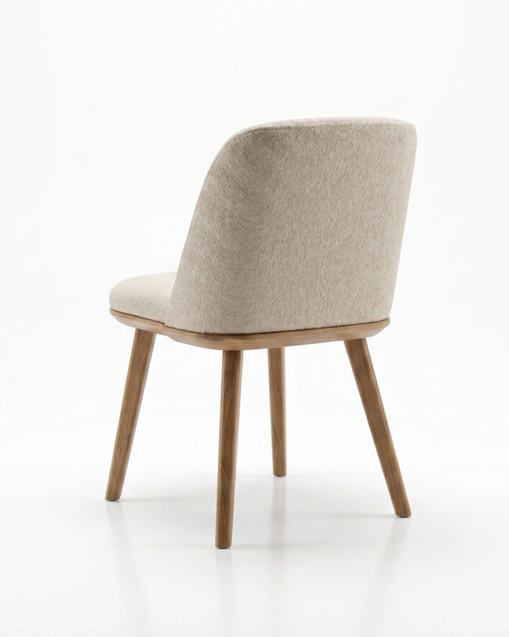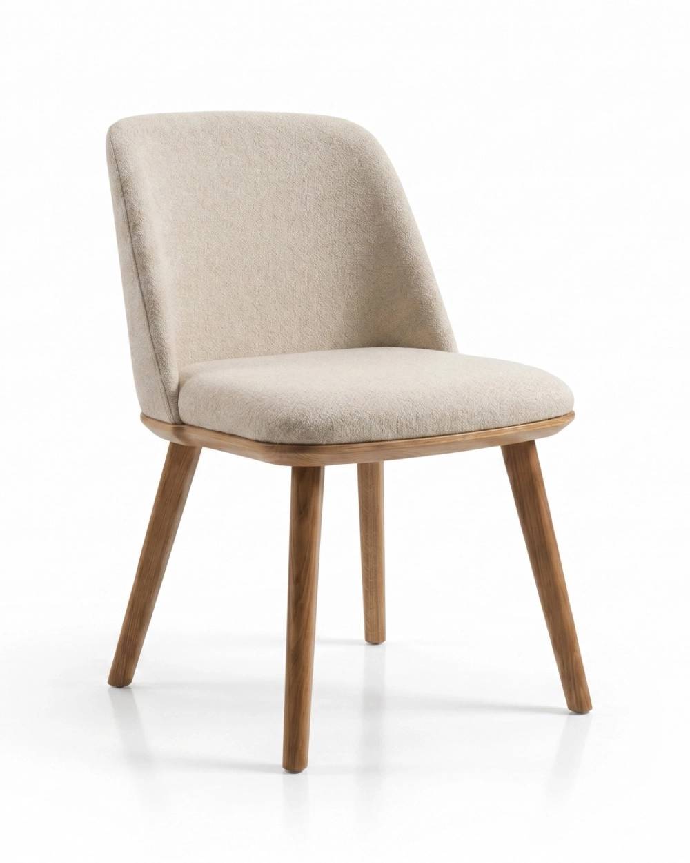 Стул с мягкой обволакивающей спинкой и текстурной обивкой на изящном деревянном основании, объединяющее комфорт и актуальную интерьерную эстетику