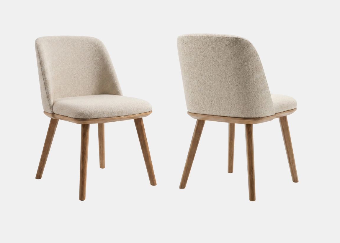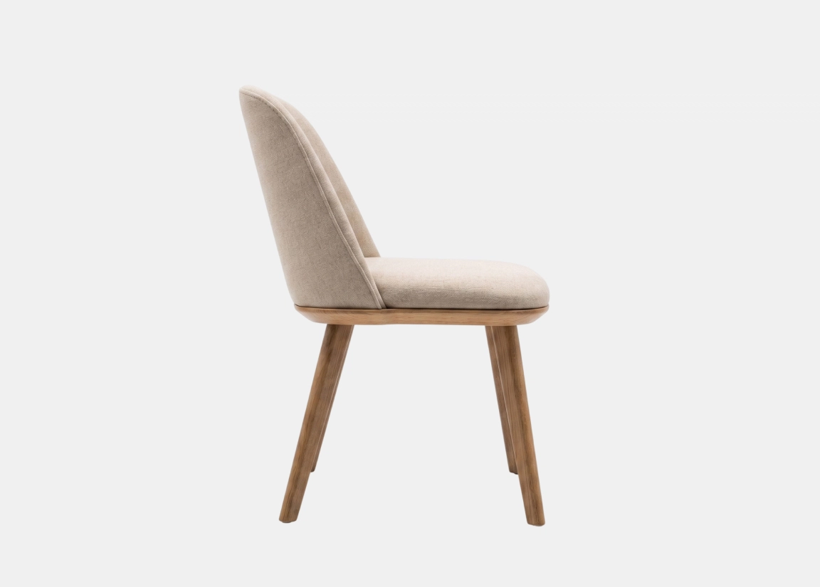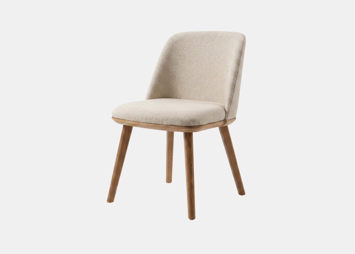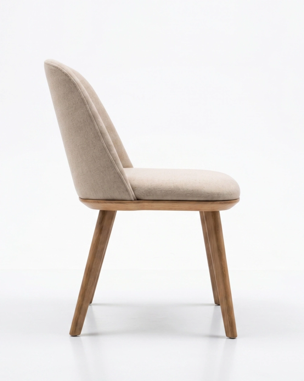 Стул с мягкой обволакивающей спинкой и текстурной обивкой на изящном деревянном основании, объединяющее комфорт и актуальную интерьерную эстетику