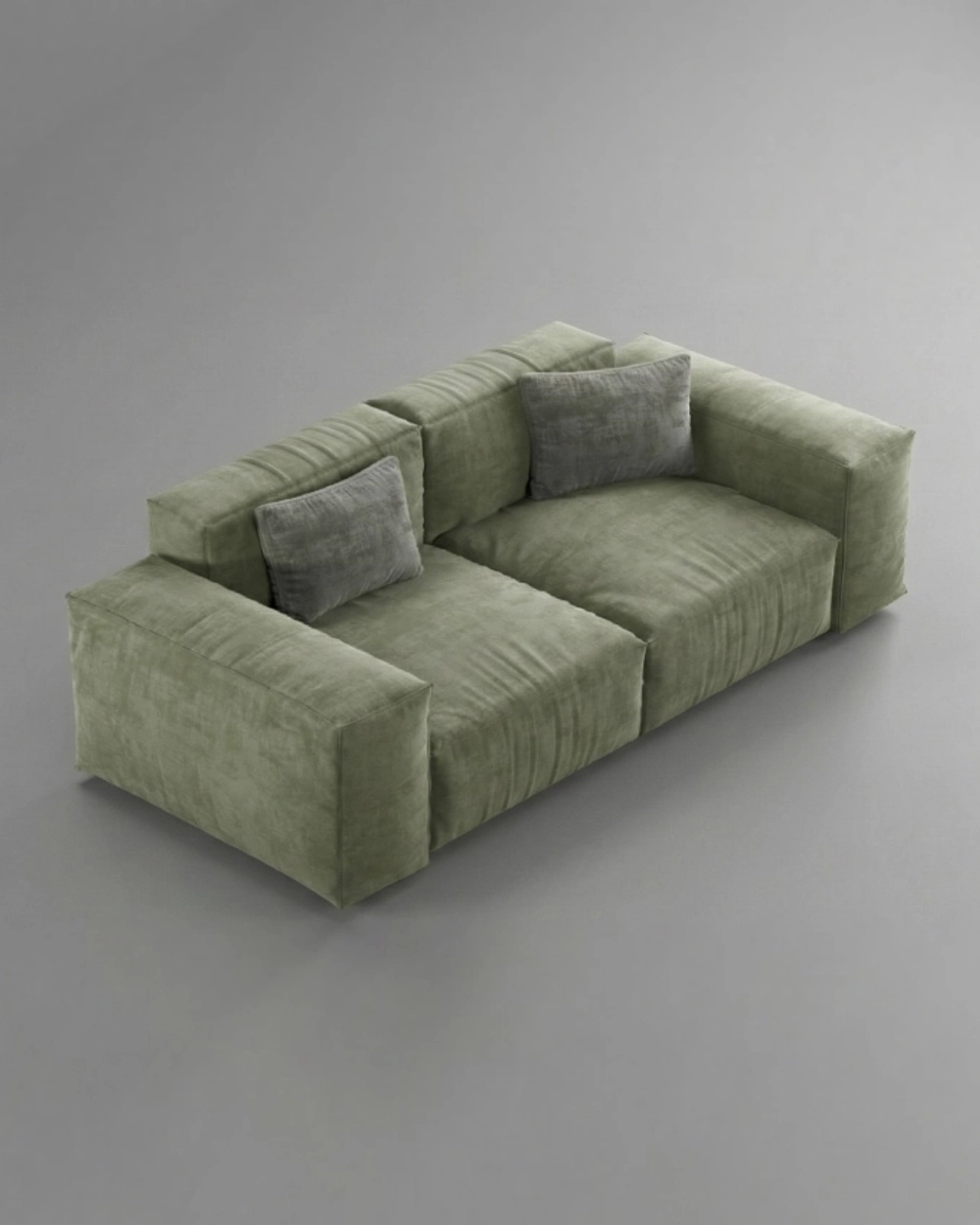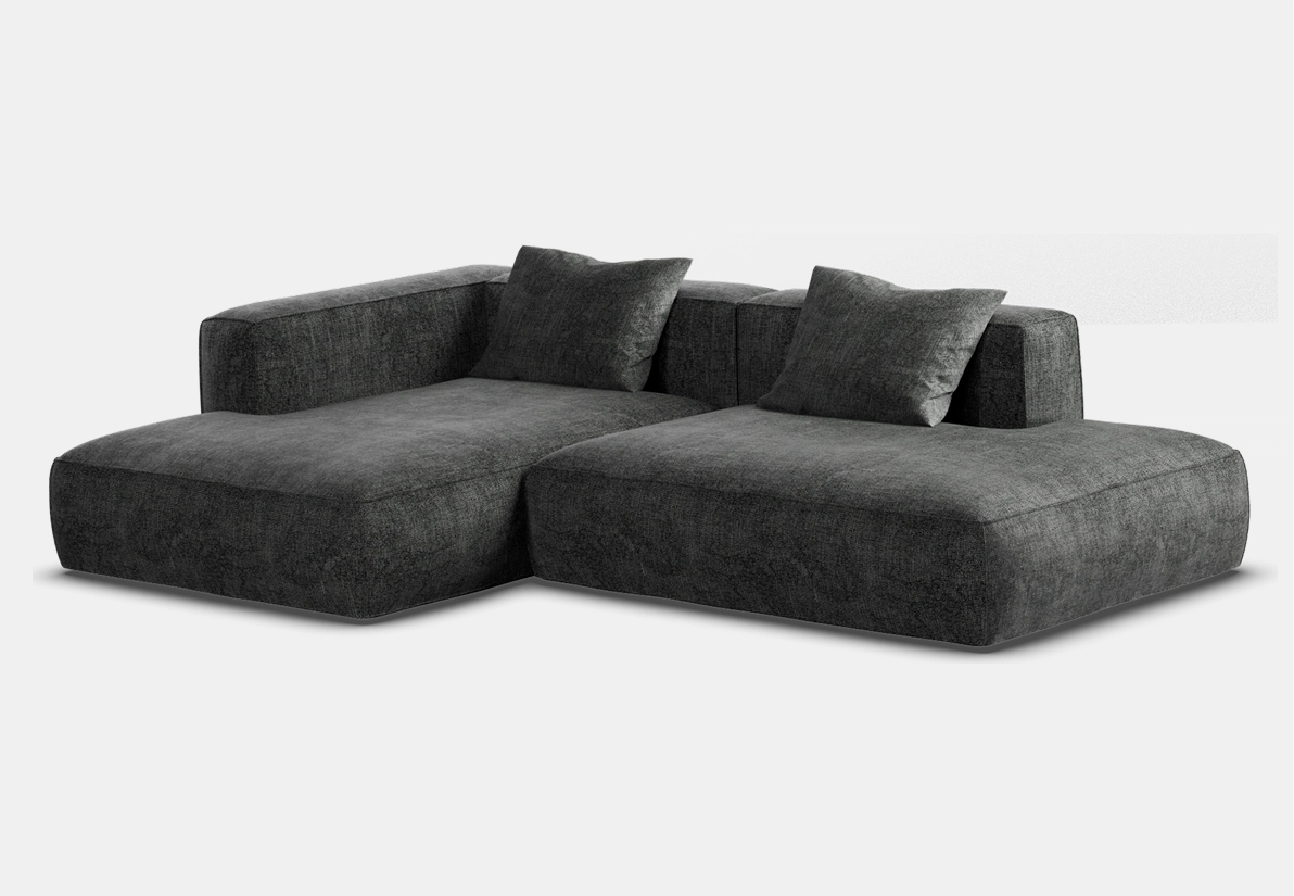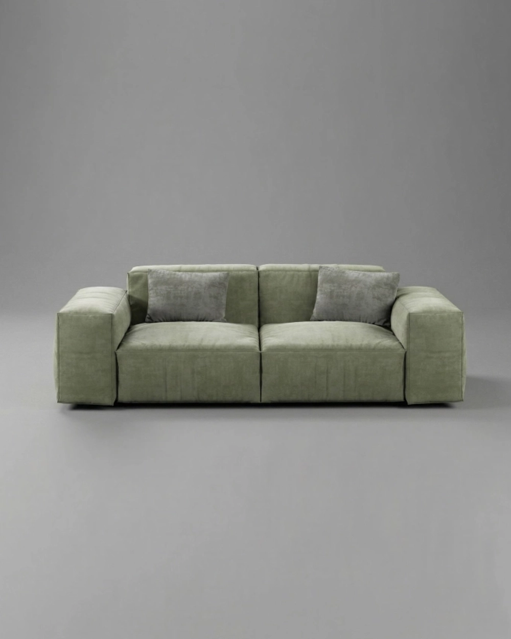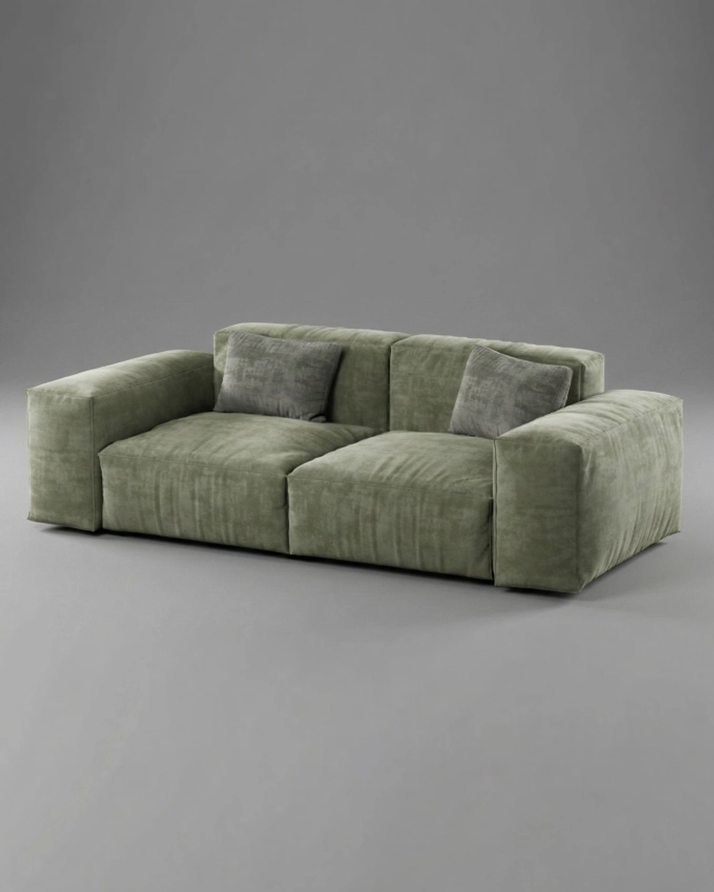 Объемный, геометрически выраженный диван, сочетающий монументальную форму с глубоким, расслабляющим комфортом