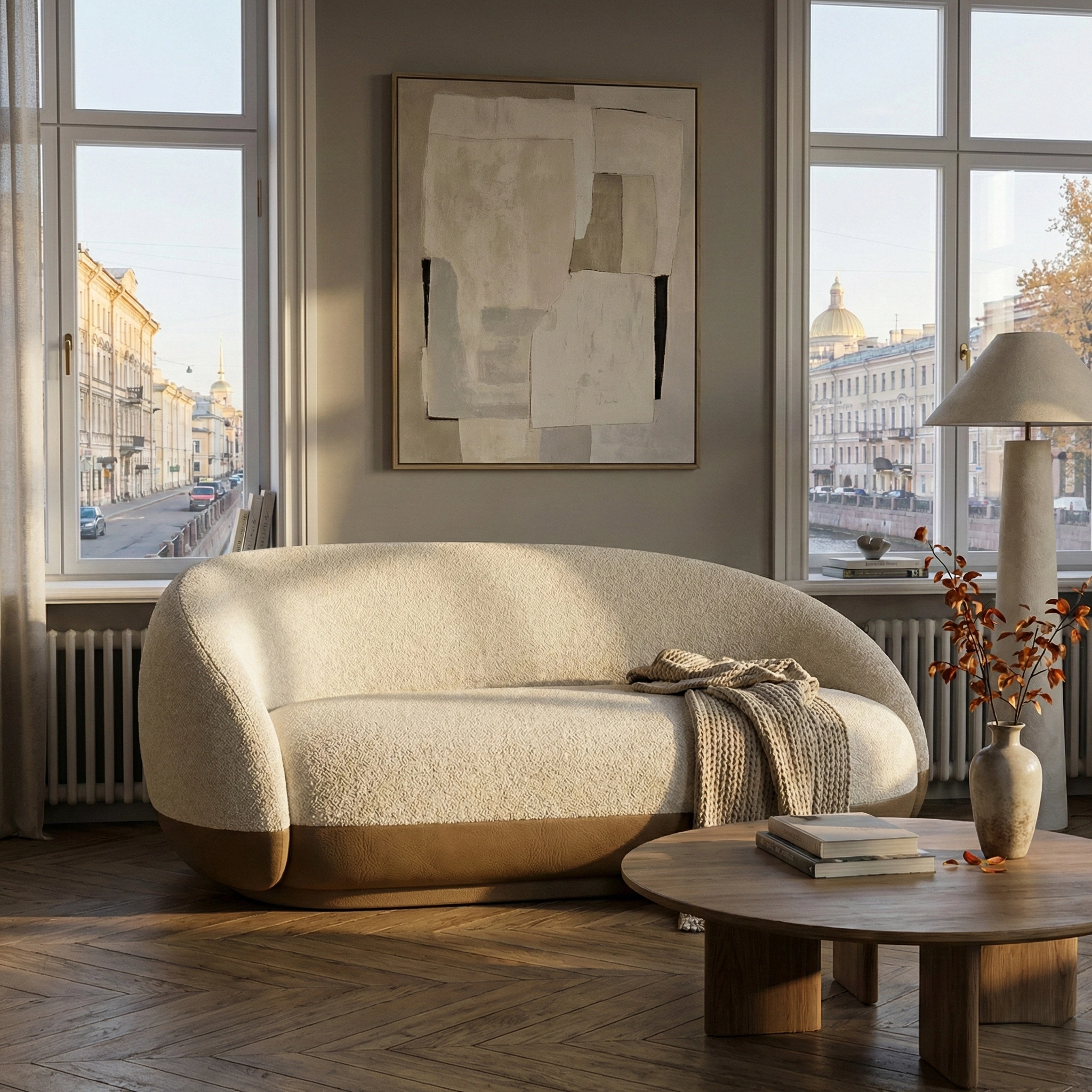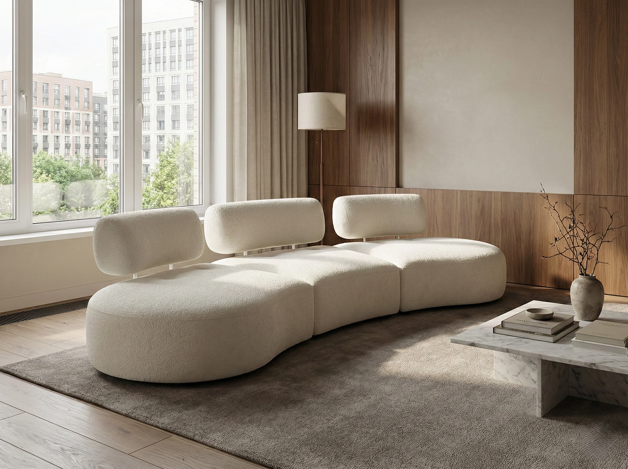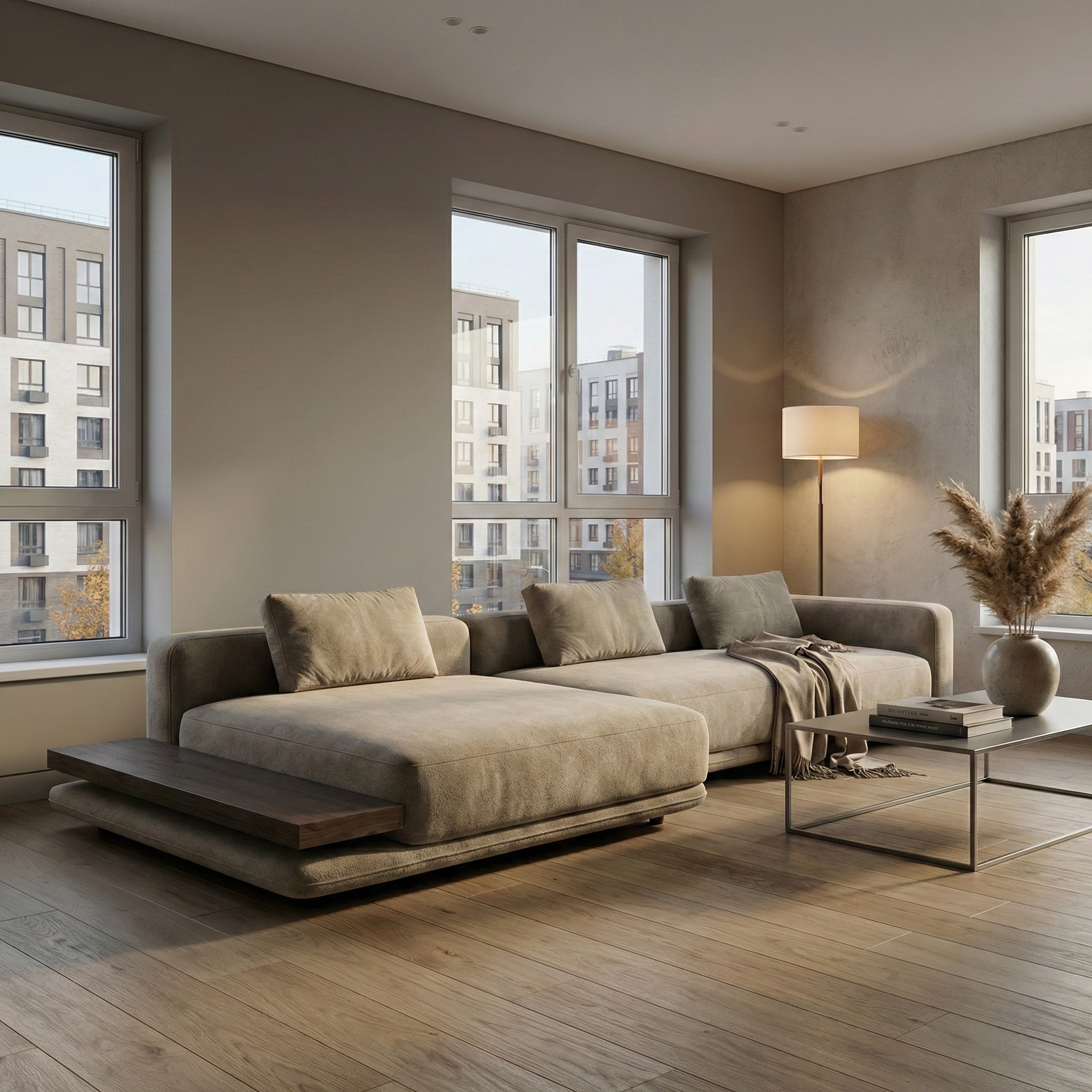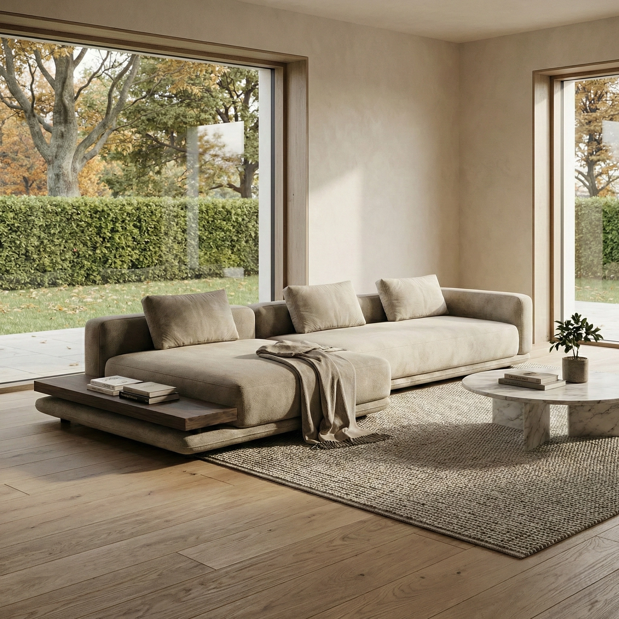 Объемный, геометрически выраженный диван, сочетающий монументальную форму с глубоким, расслабляющим комфортом