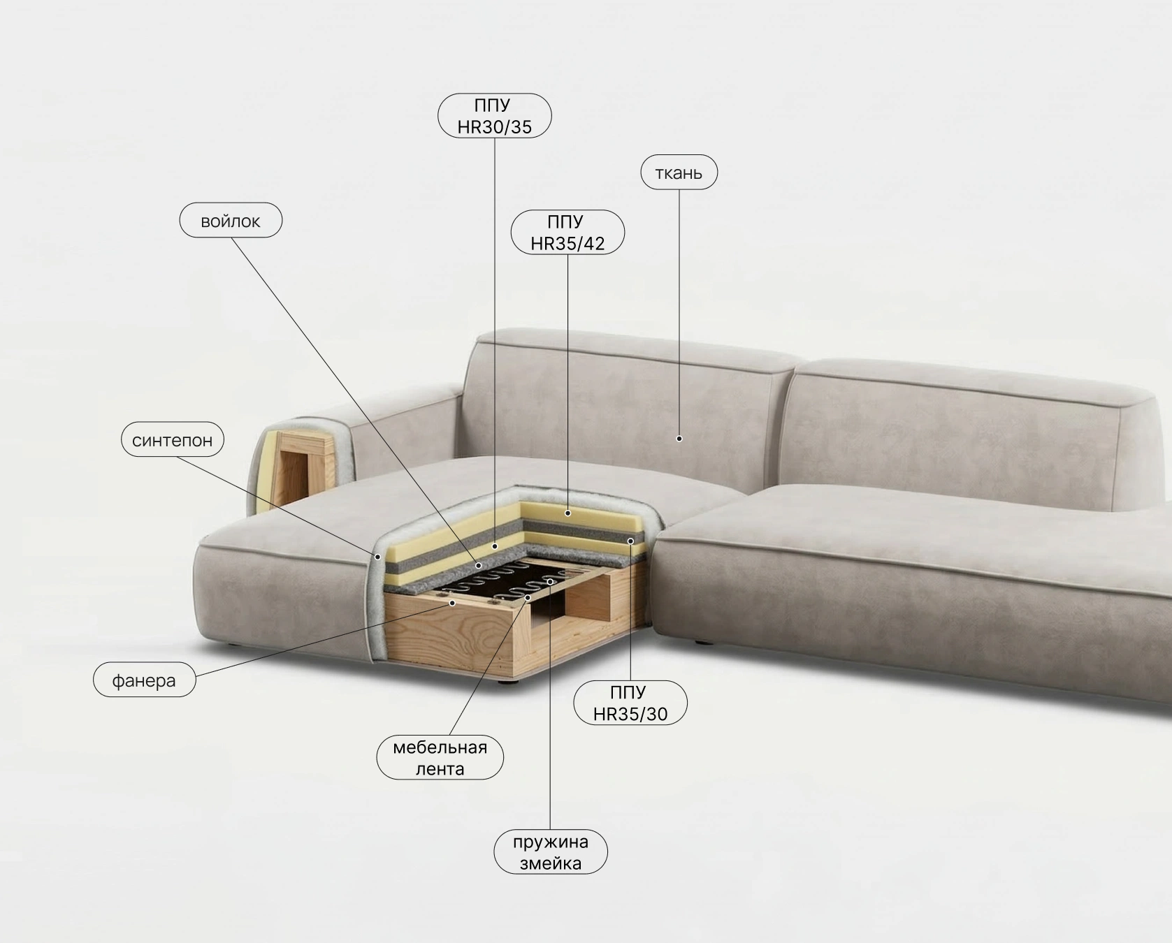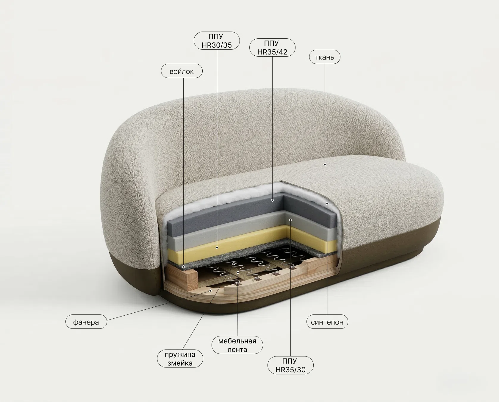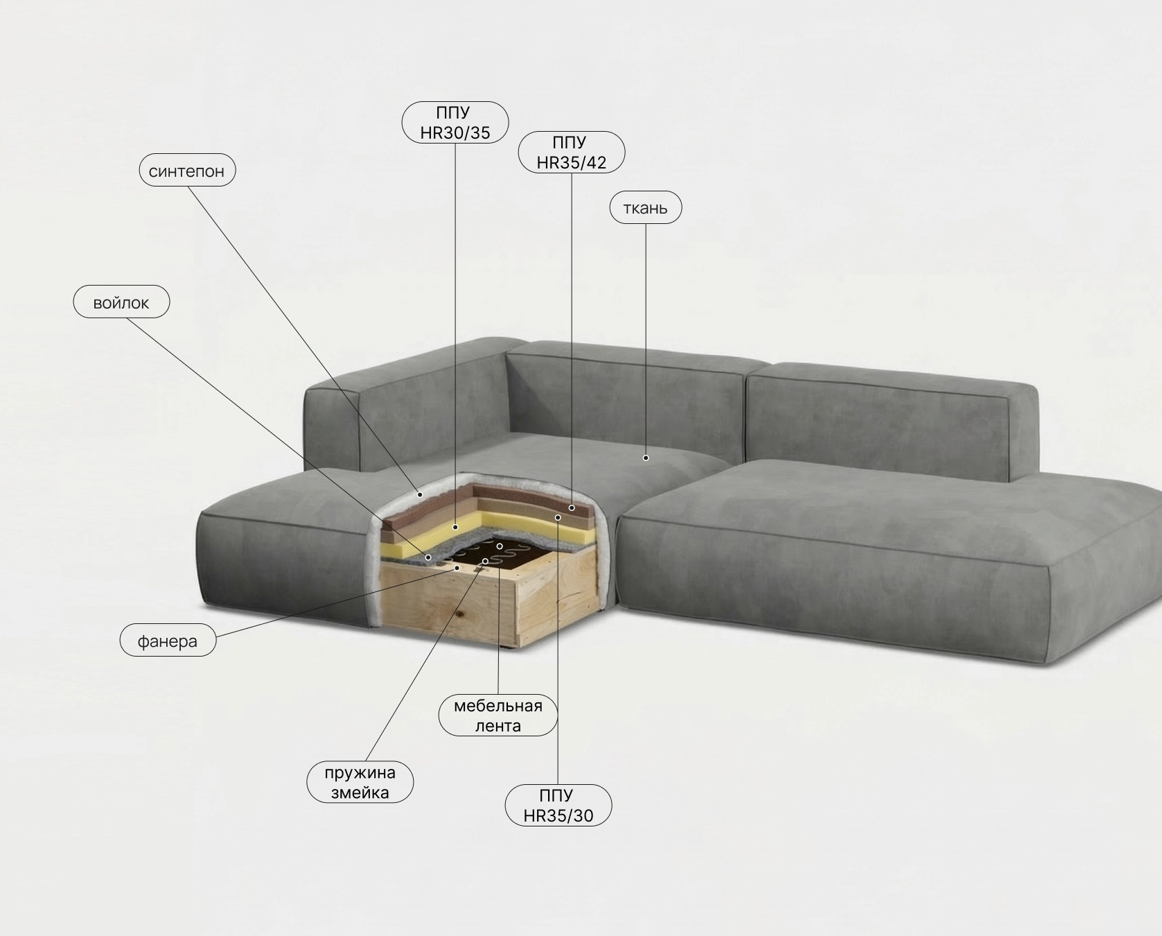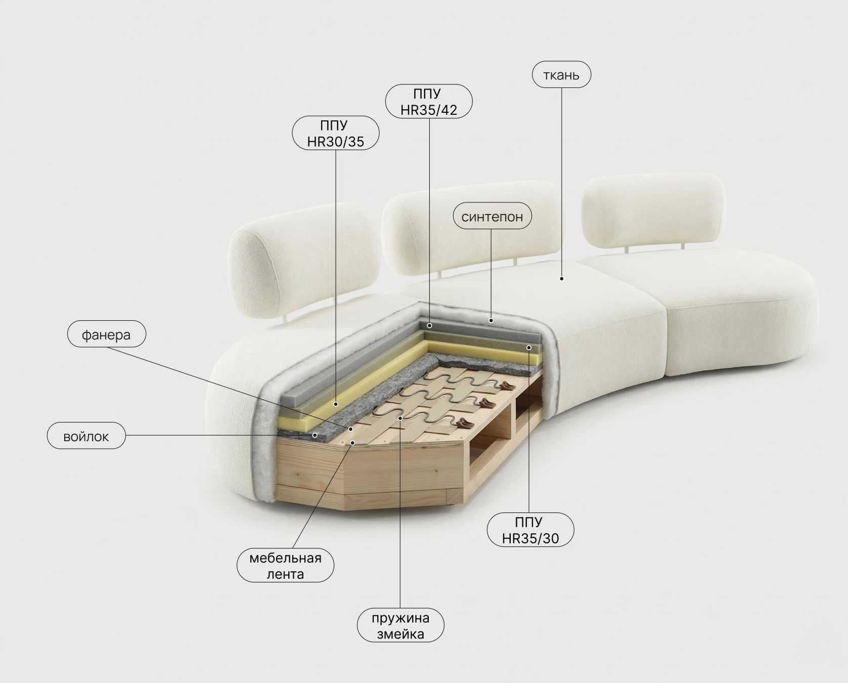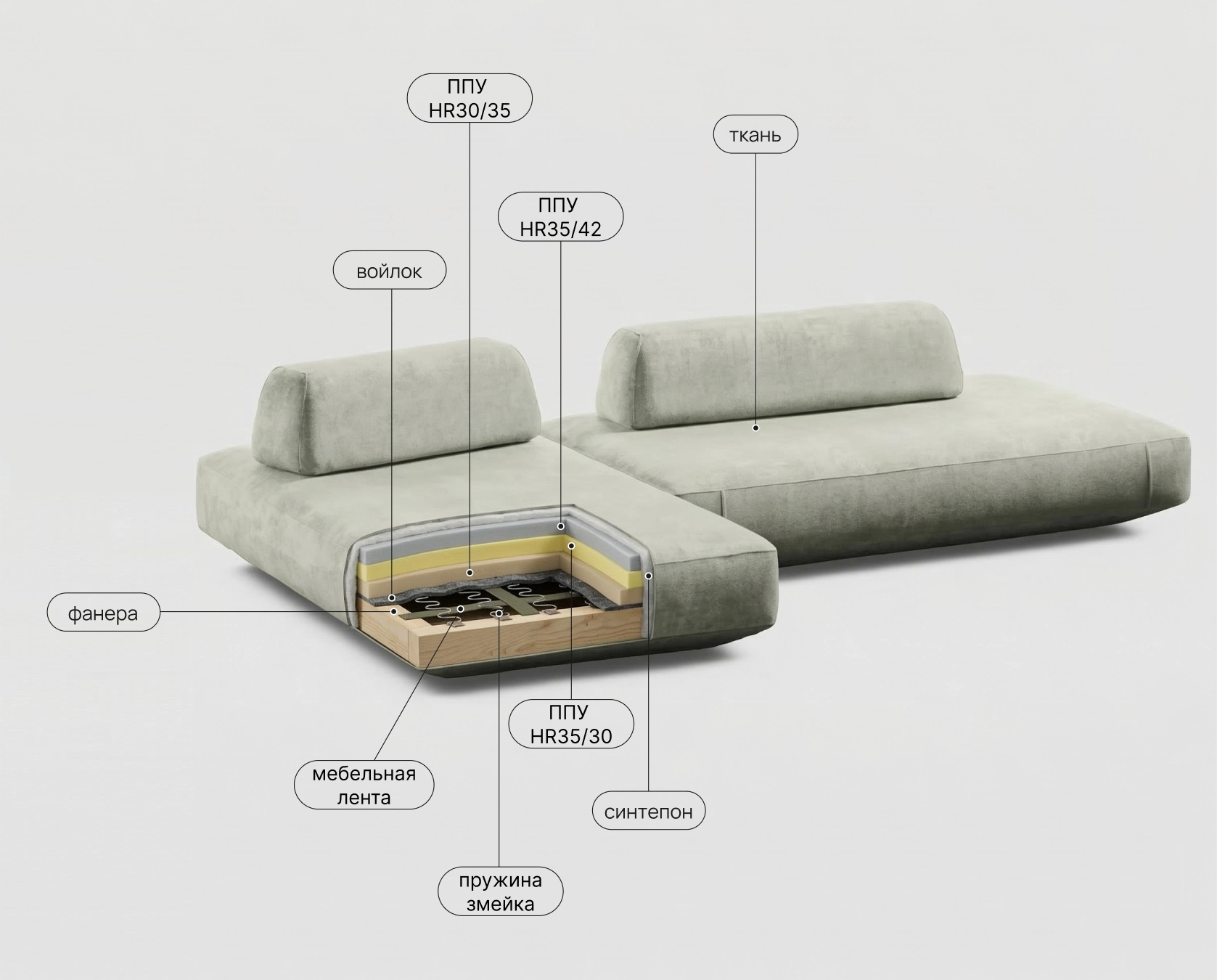 Прочная мебельная лента в основе сиденья. Создает гибкую, дышащую и исключительно долговечную основу для наполнителей. Предотвращает продавливание и дискомфорт