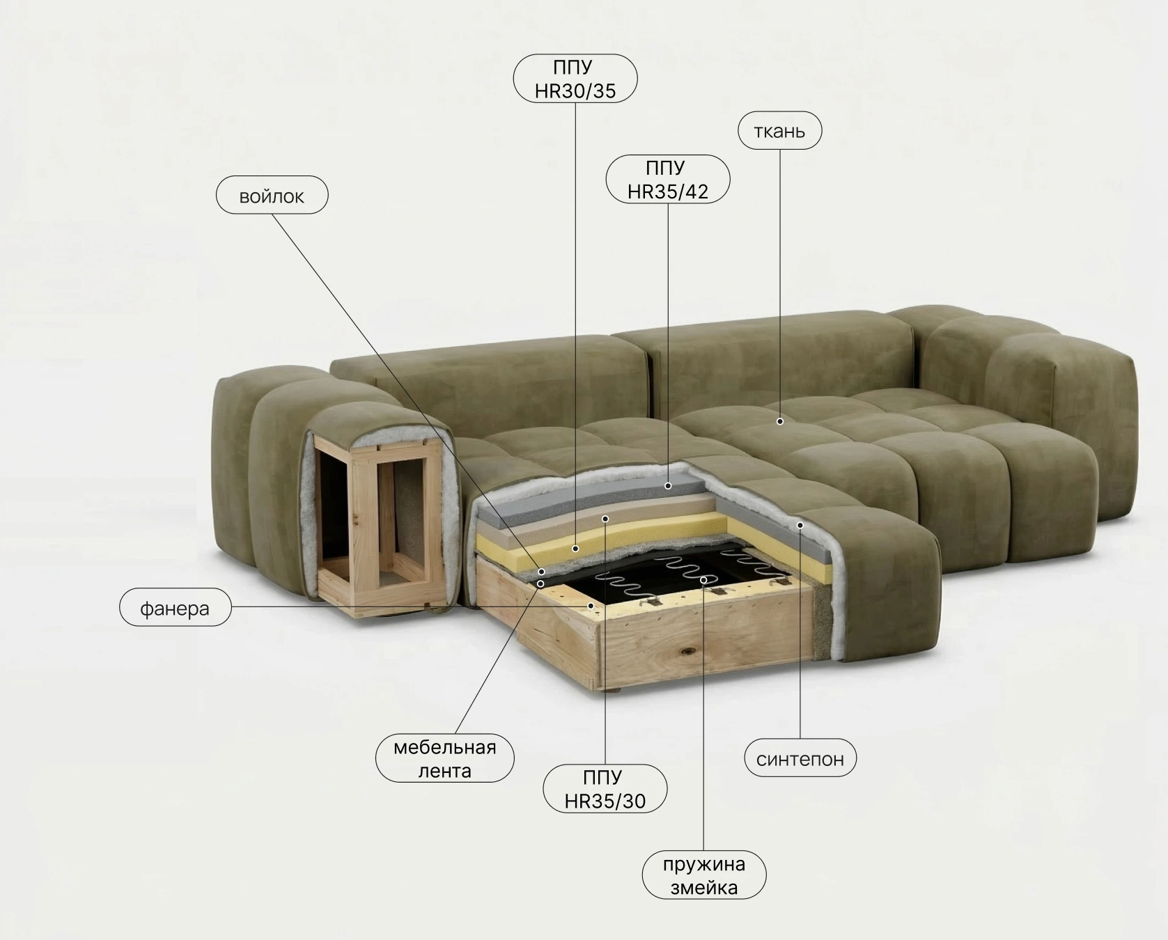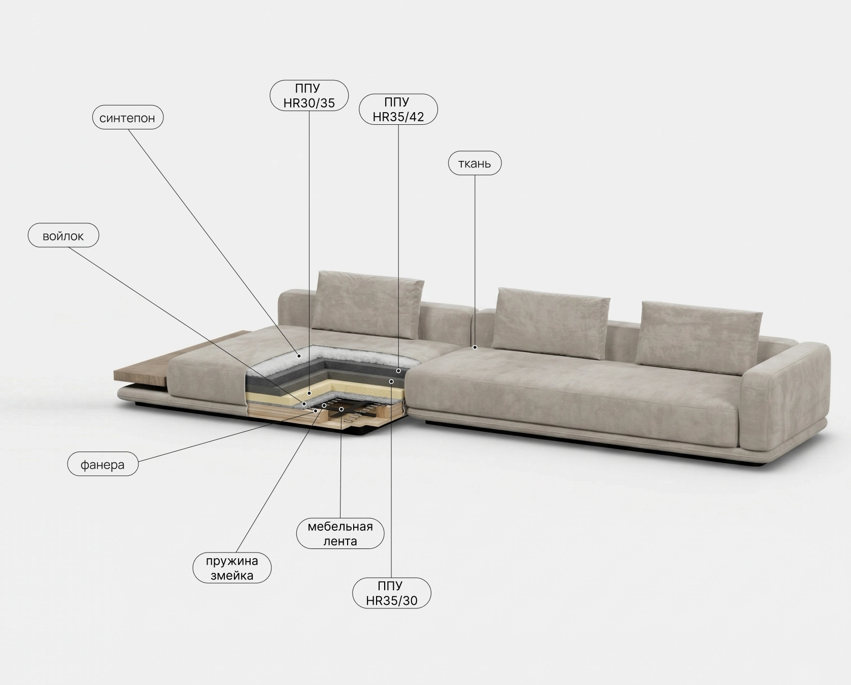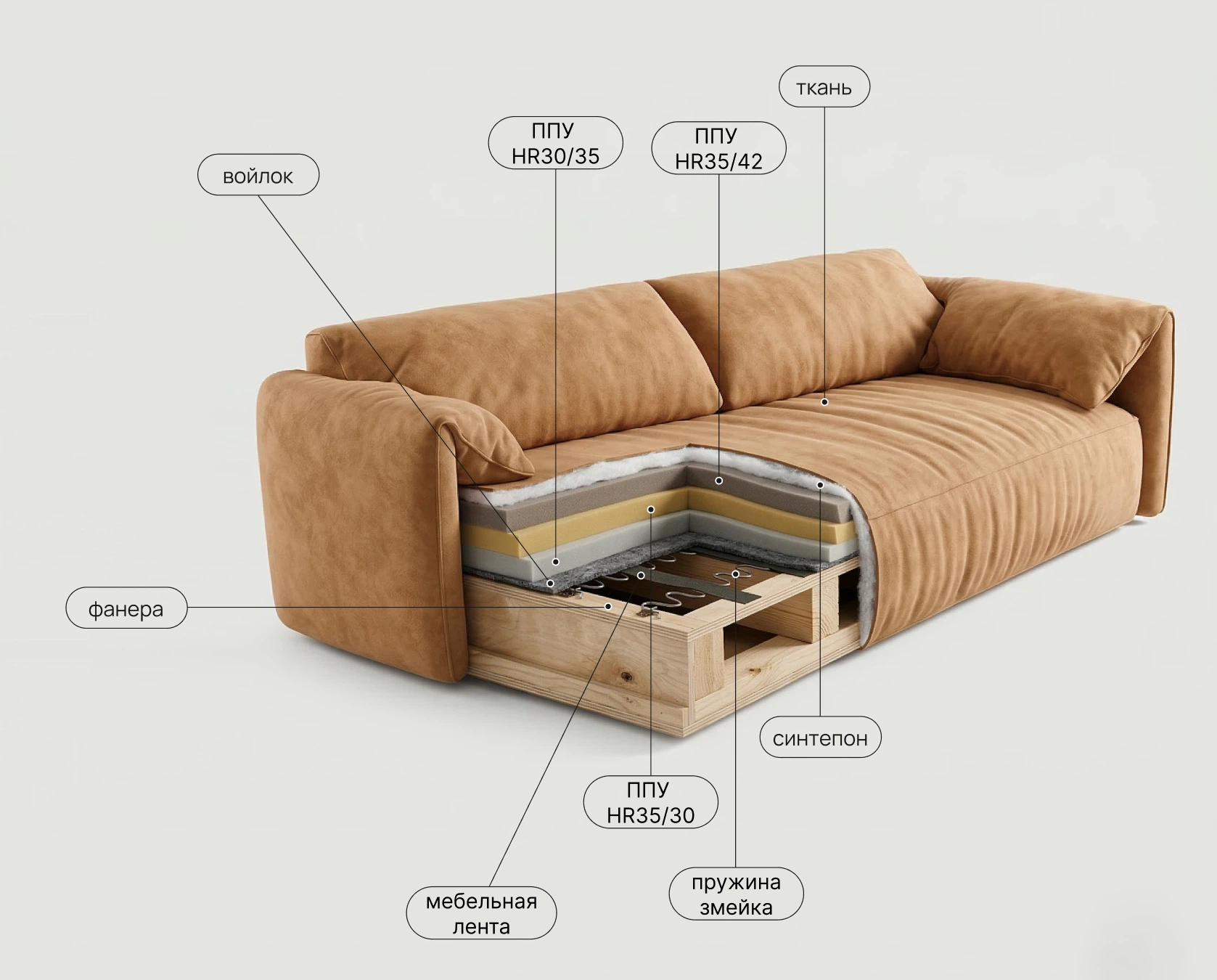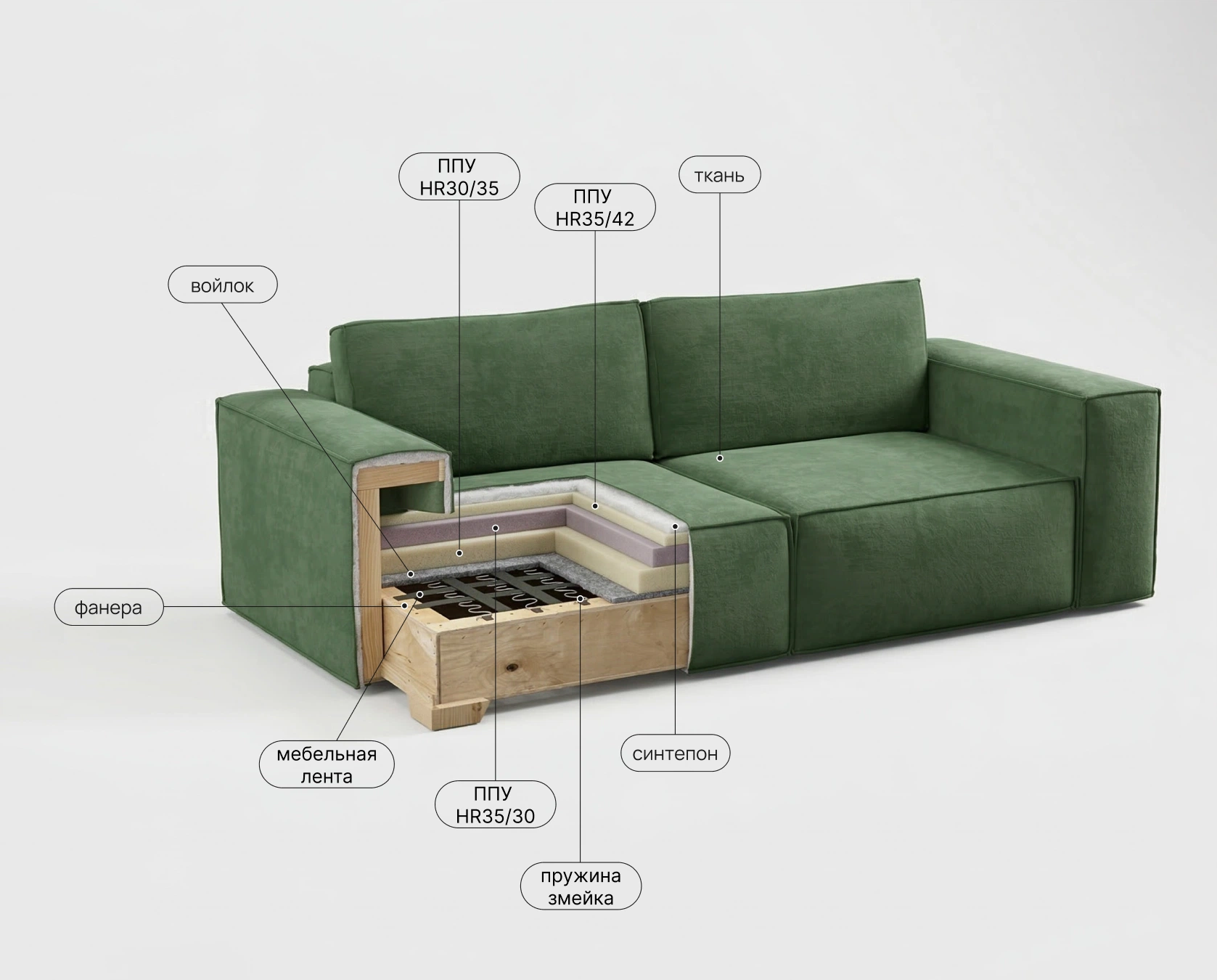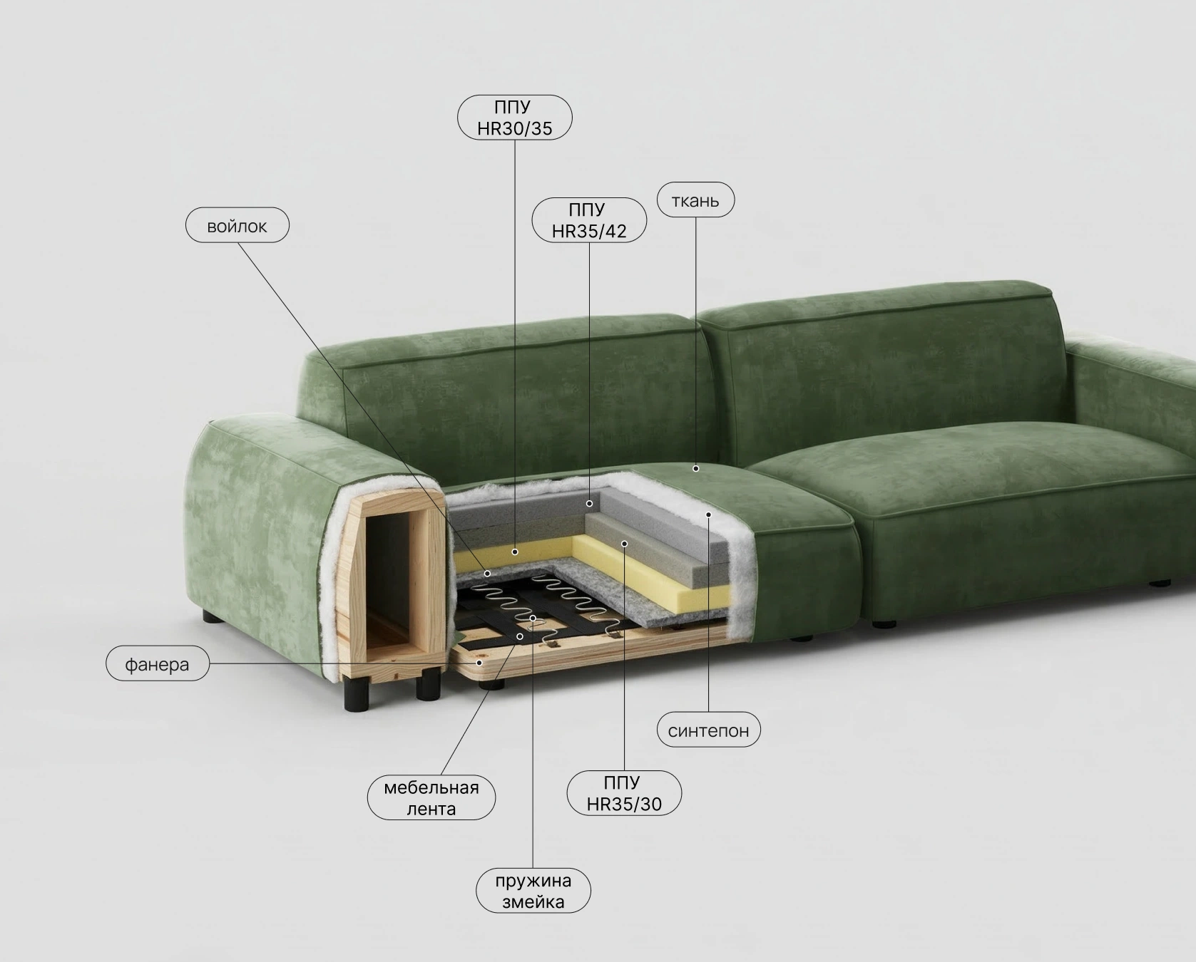 Прочная мебельная лента в основе сиденья. Создает гибкую, дышащую и исключительно долговечную основу для наполнителей. Предотвращает продавливание и дискомфорт