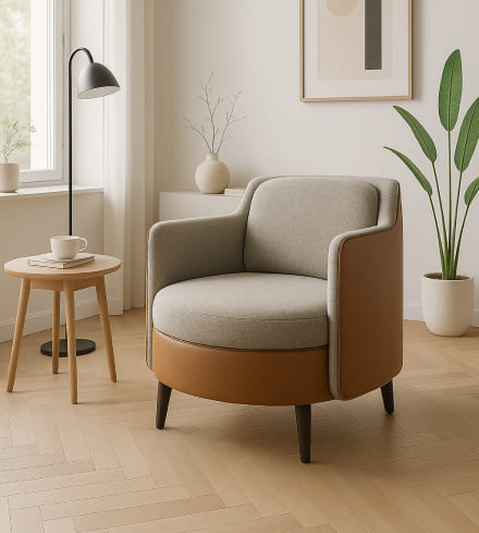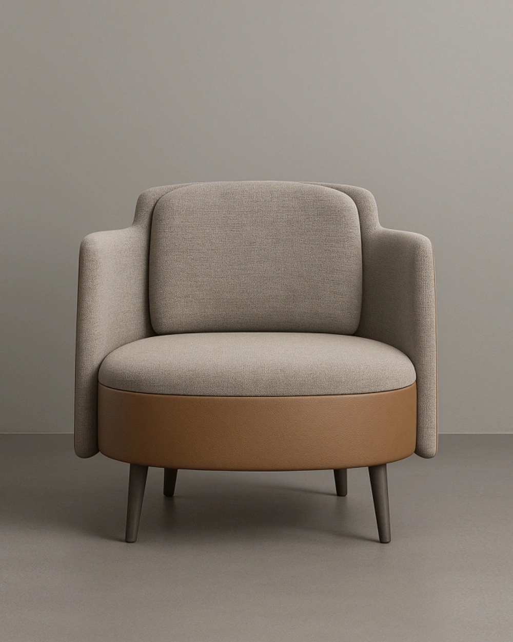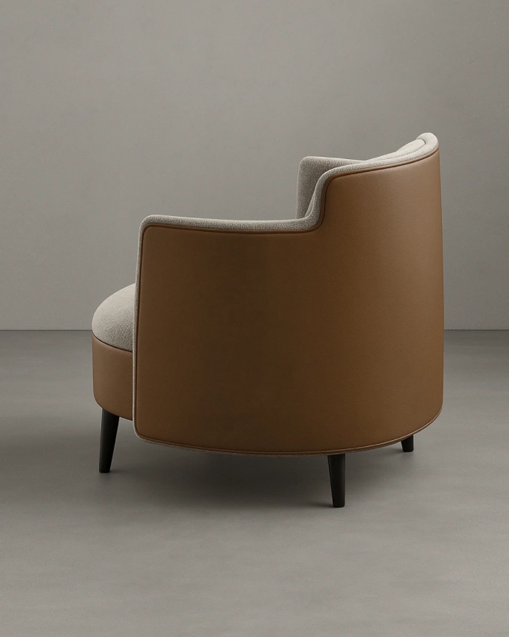 Кресло с мягким круглым сиденьем и оригинальной асимметричной спинкой, обрамлённой изящными линиями на деревянных ножках