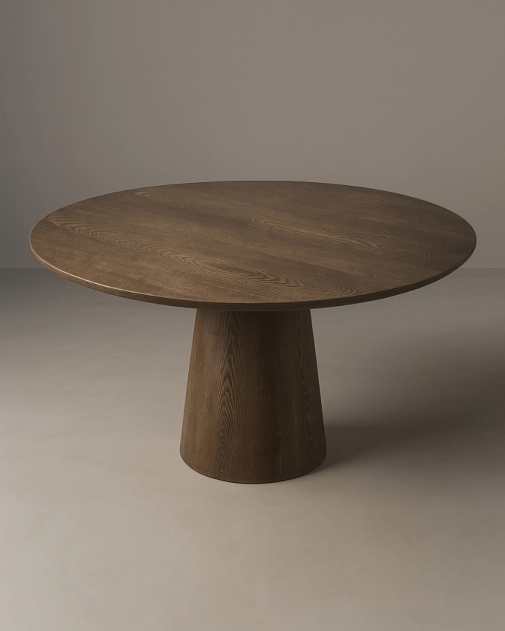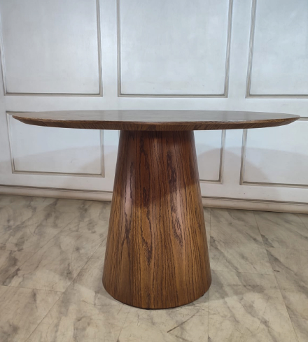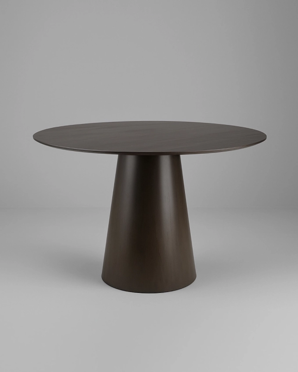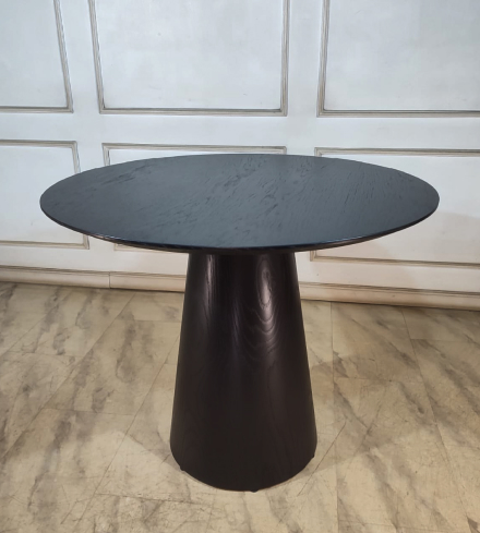 Стол с лаконичной конической опорой и широкой столешницей, где строгость формы сочетается с выразительным современным стилем