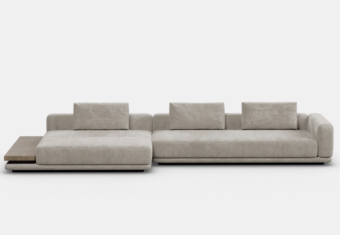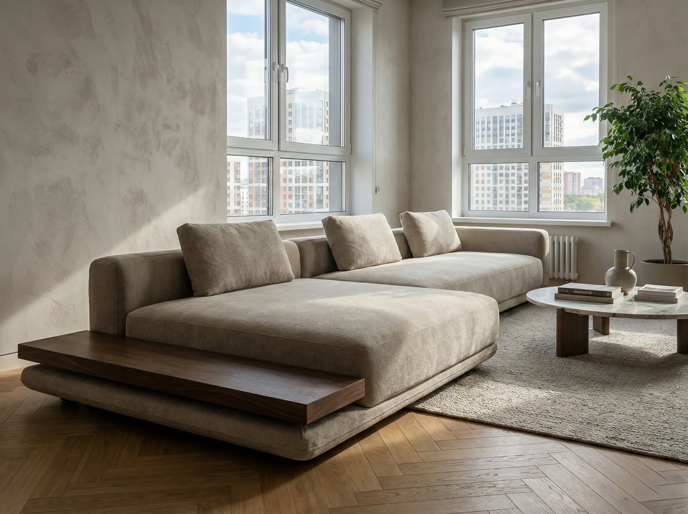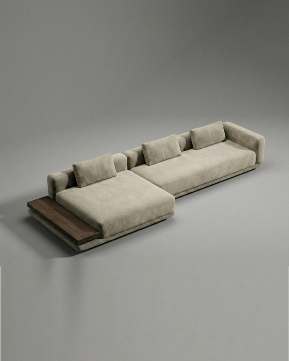 Низкий модульный диван с широкими плоскостями, интегрированной приставной тумбой и спокойной фактурой, формирующий статусную lounge-зону
