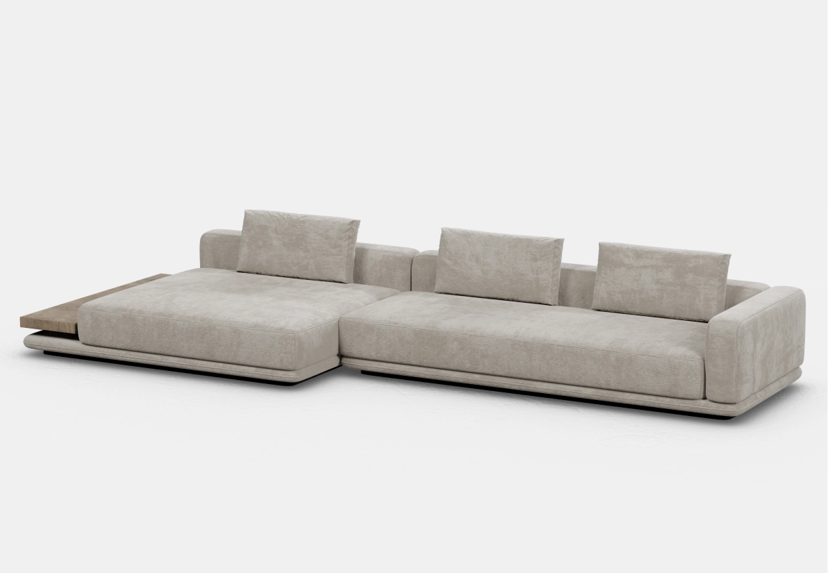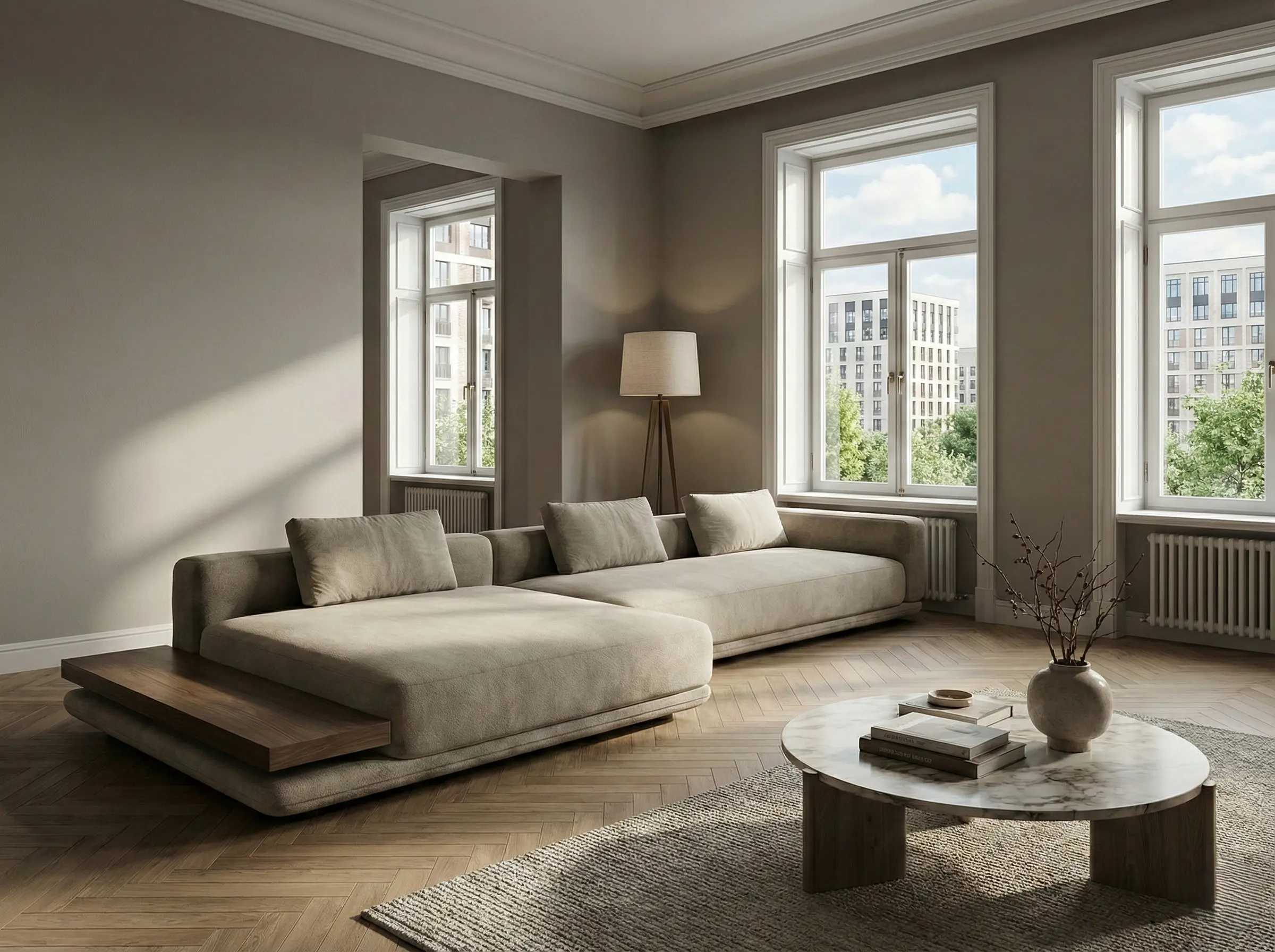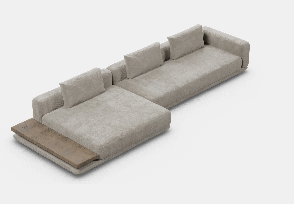 Низкий модульный диван с широкими плоскостями, интегрированной приставной тумбой и спокойной фактурой, формирующий статусную lounge-зону