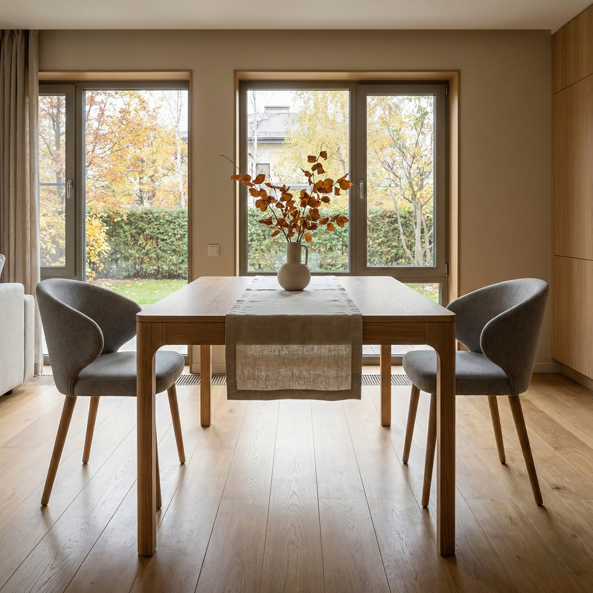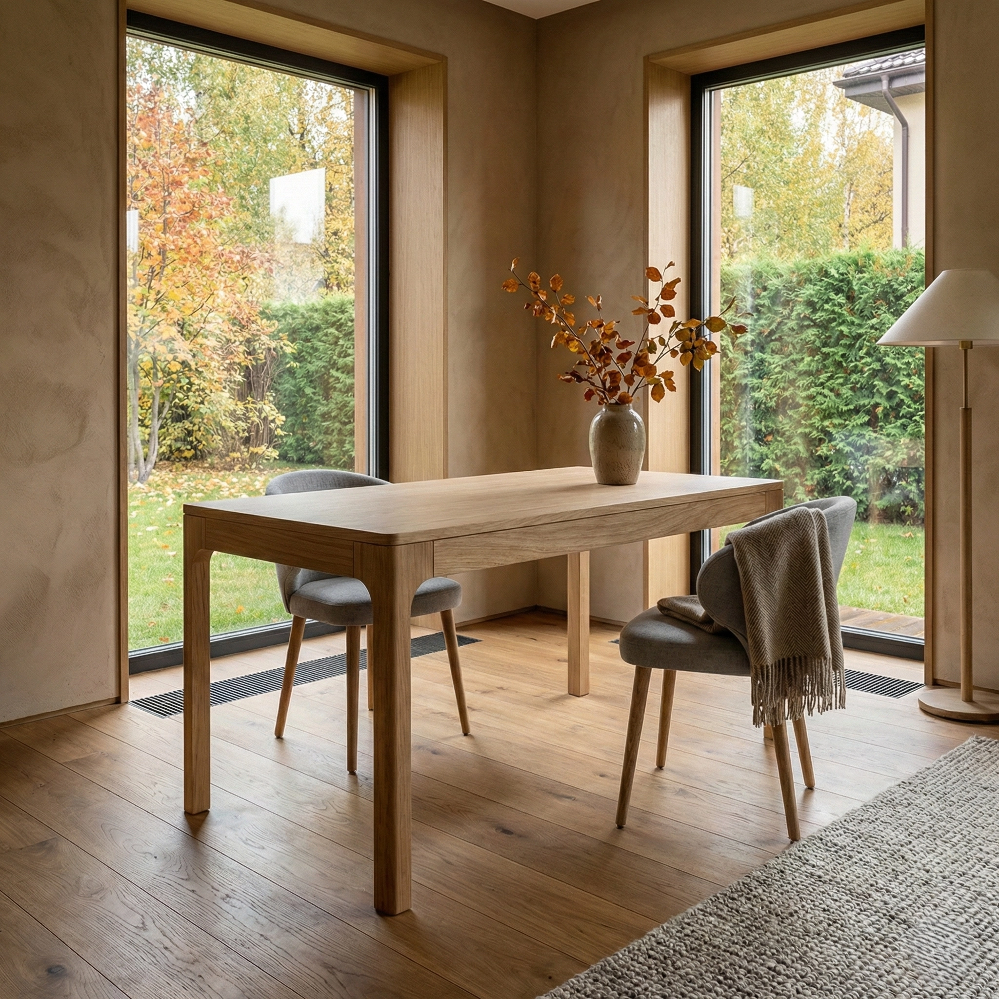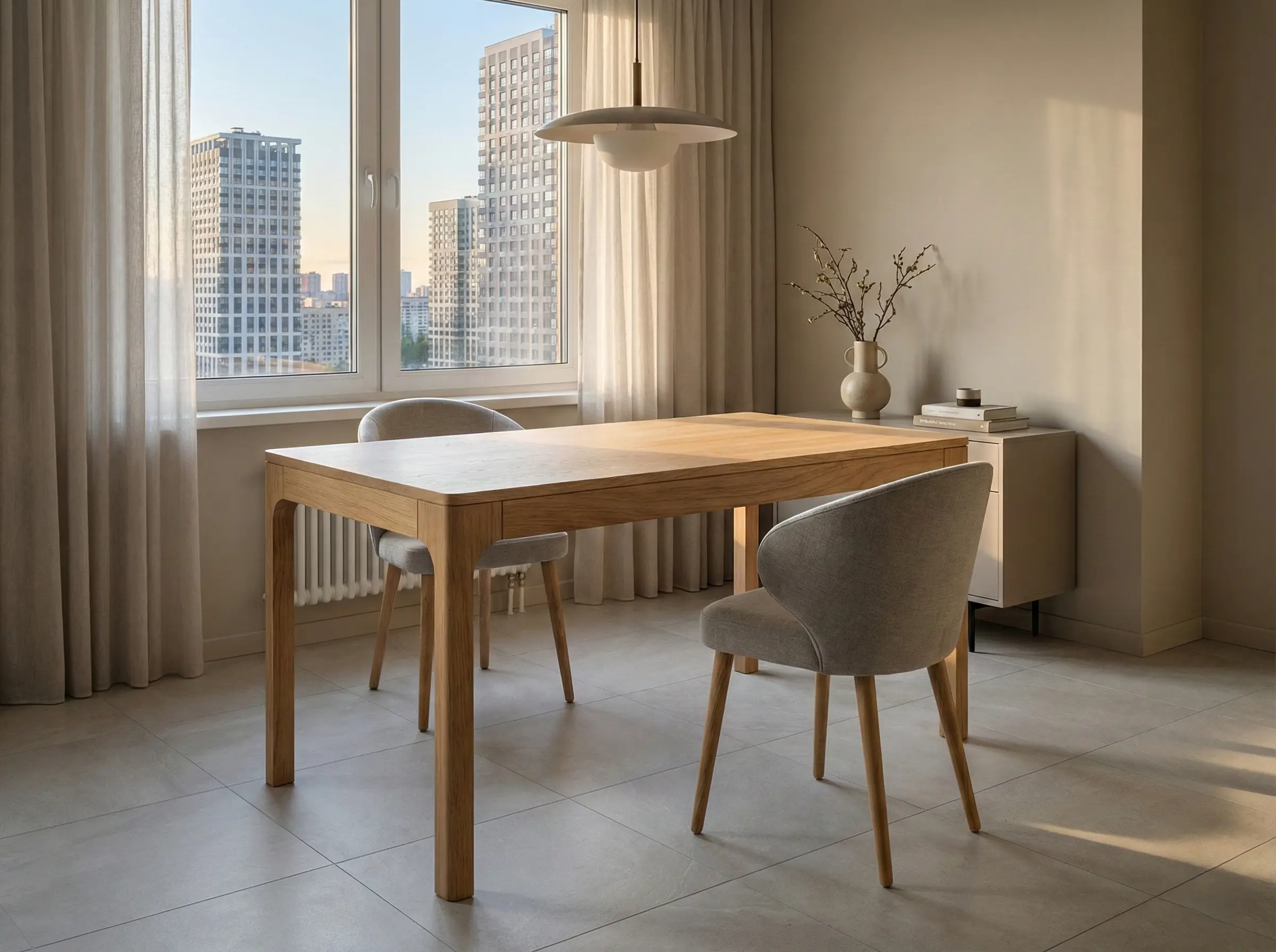 Лаконичный стол из светлого массива с чистыми линиями и мягко скруглёнными переходами, органично дополняющий современные и скандинавские интерьеры