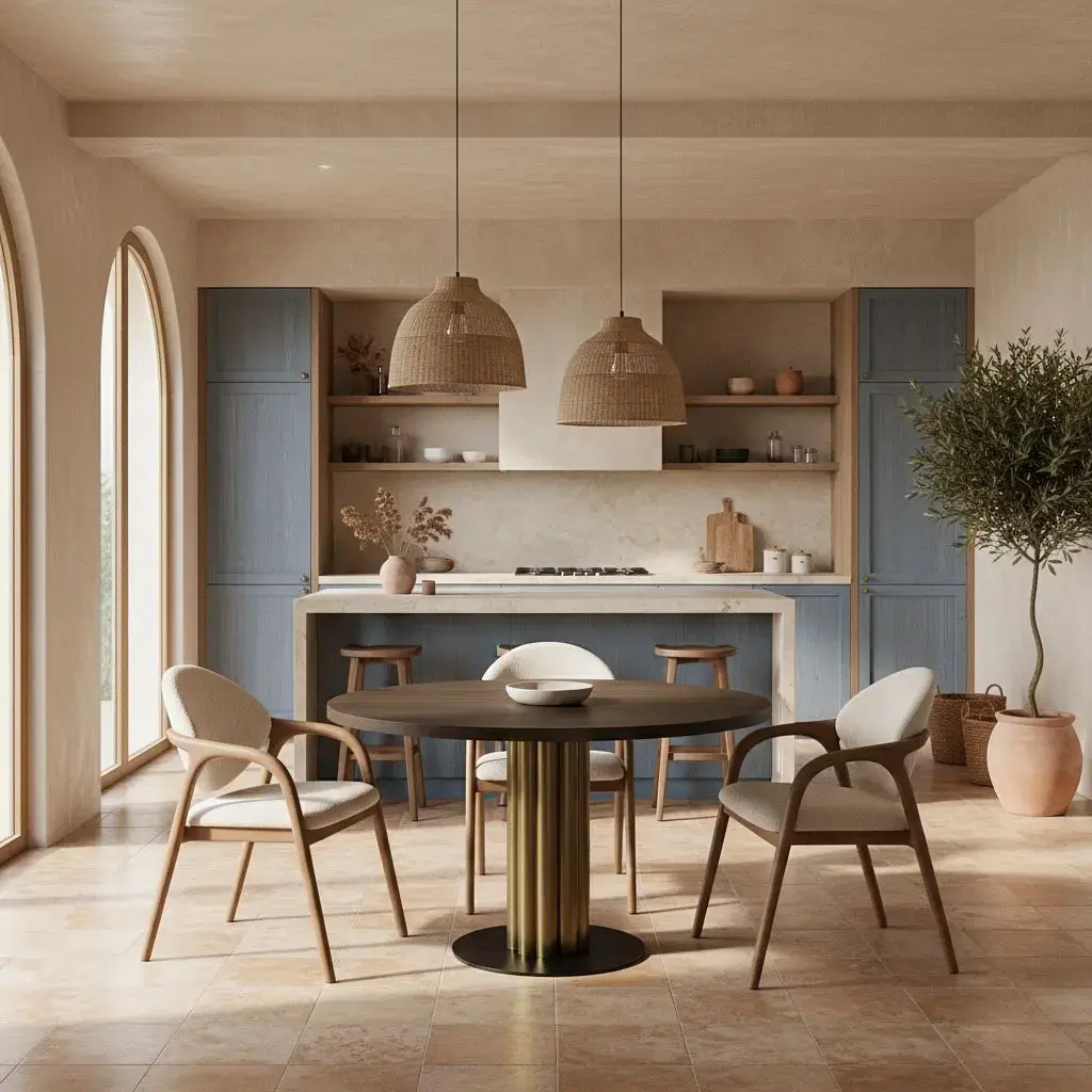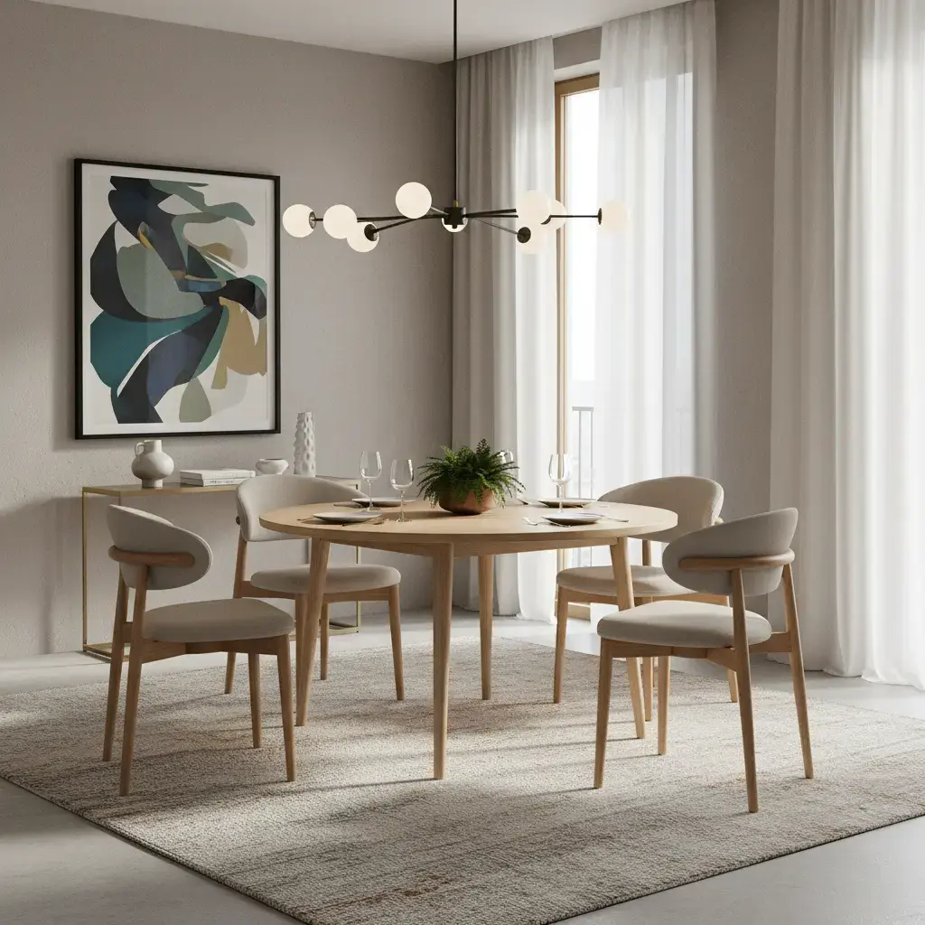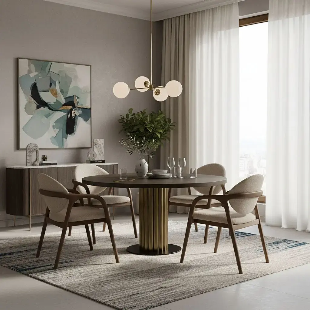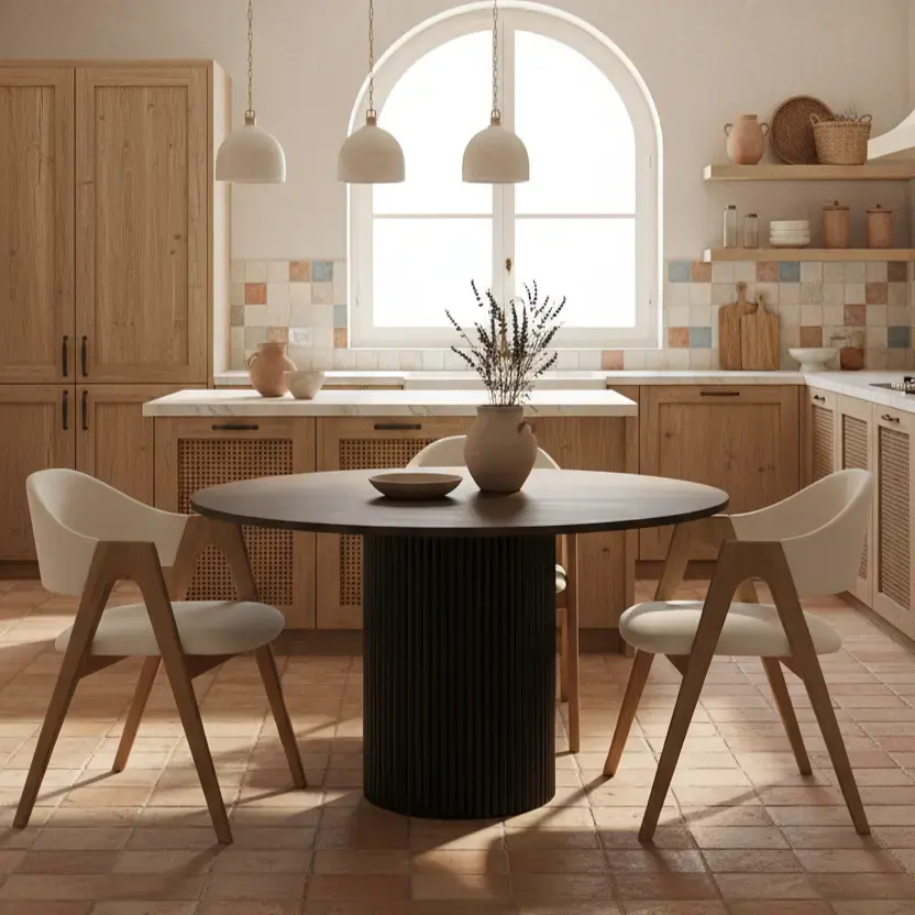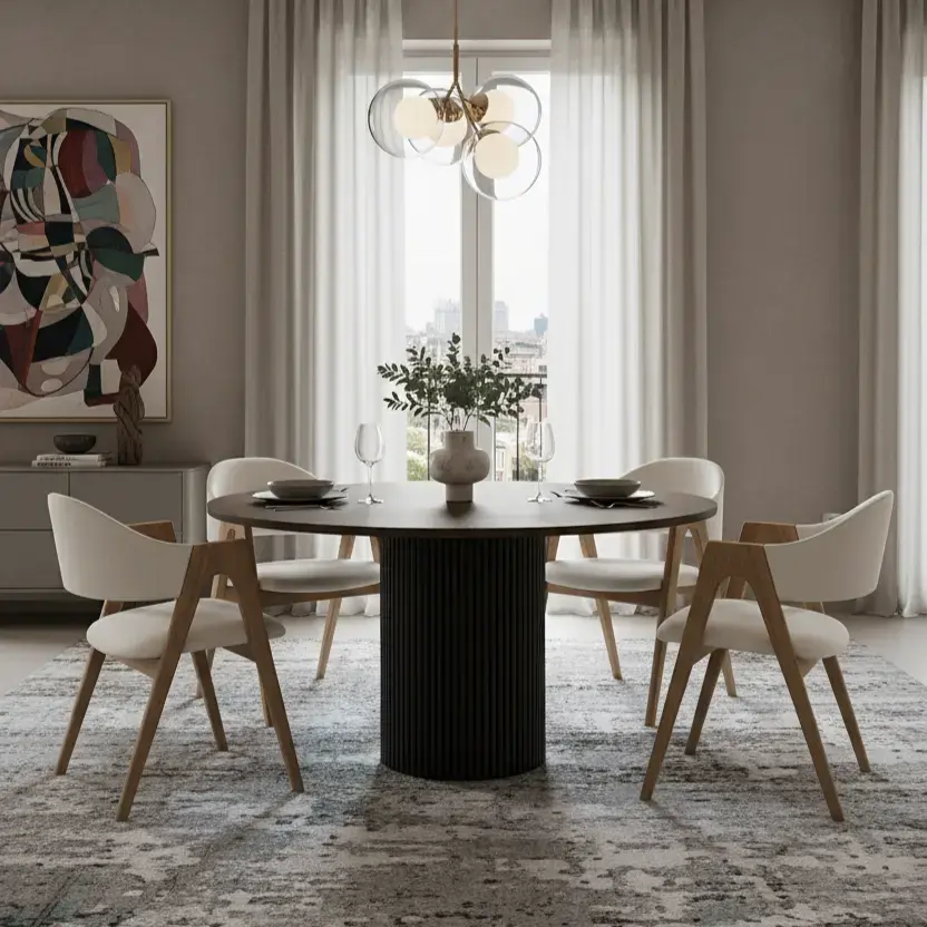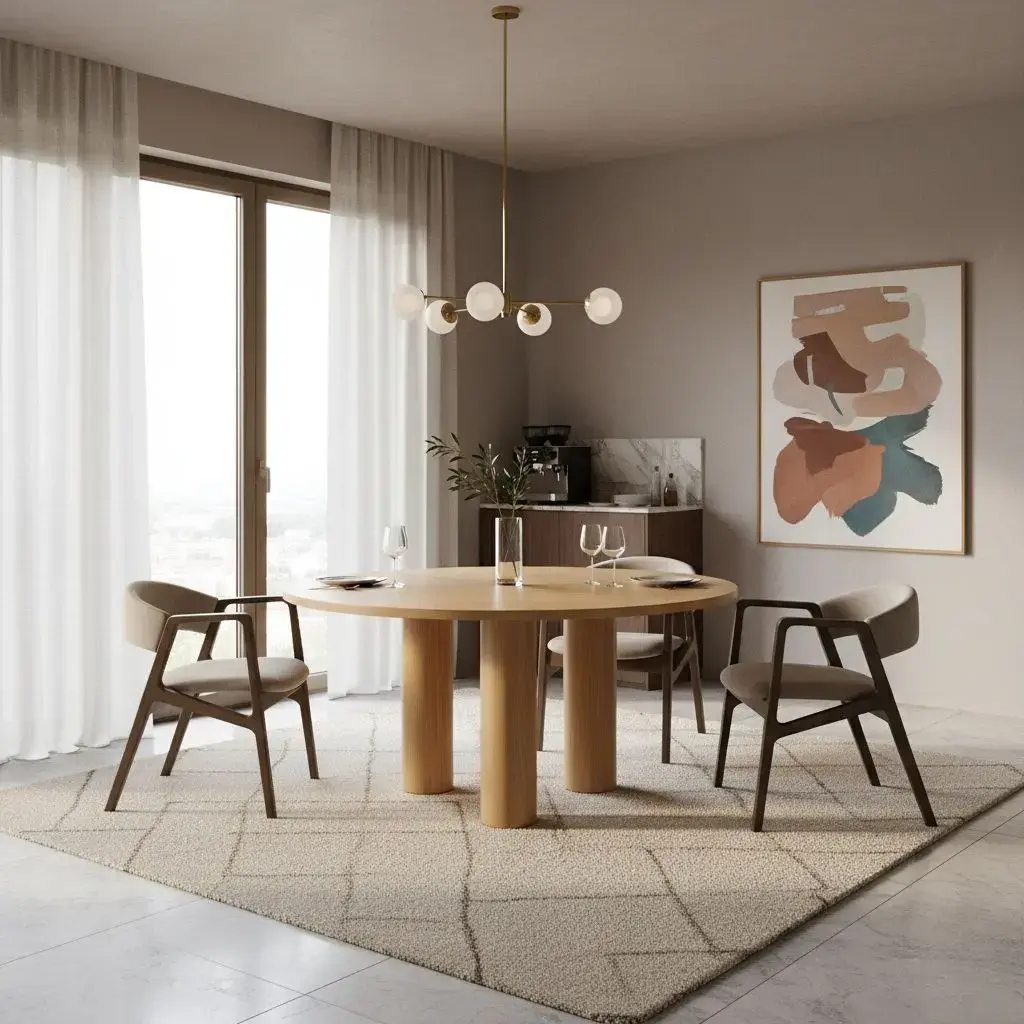 Круглый стол с массивными цилиндрическими опорами — сочетание архитектурной выразительности и естественной теплоты дерева