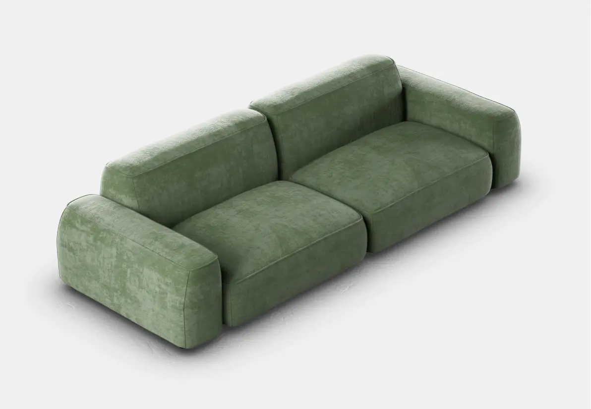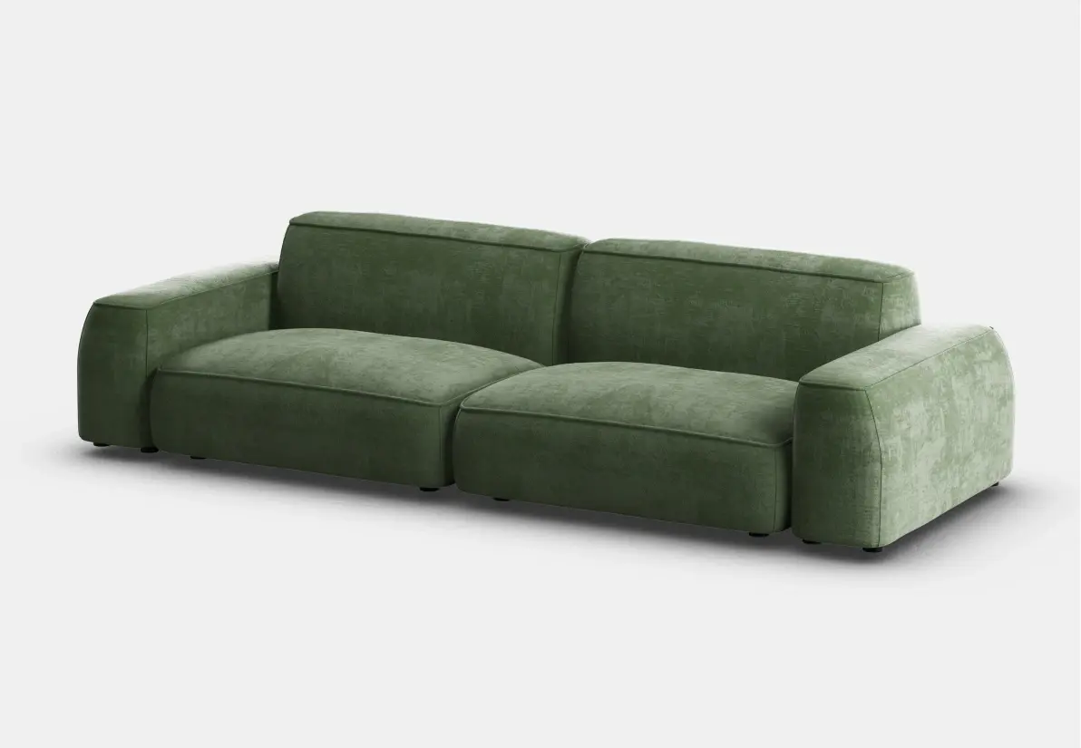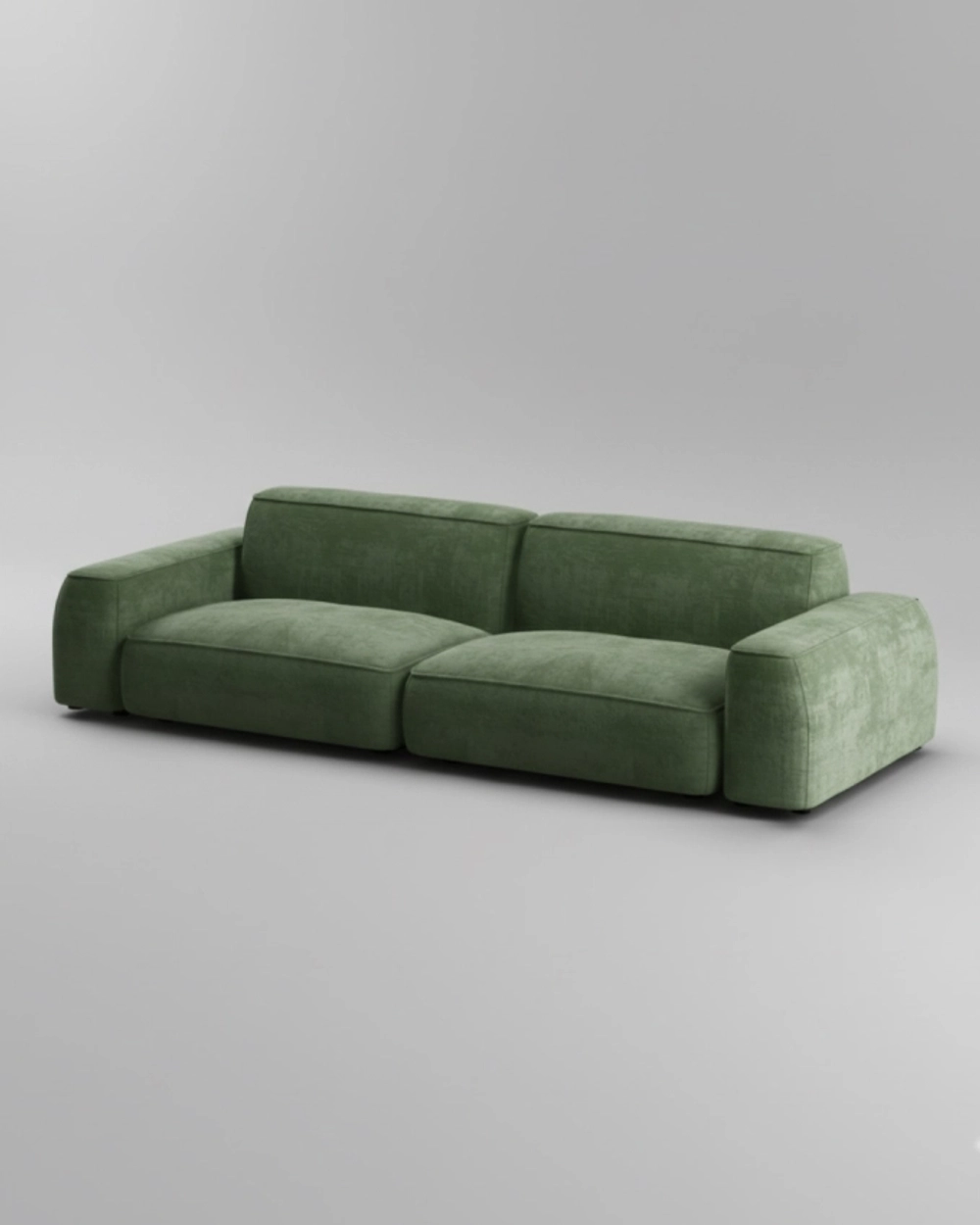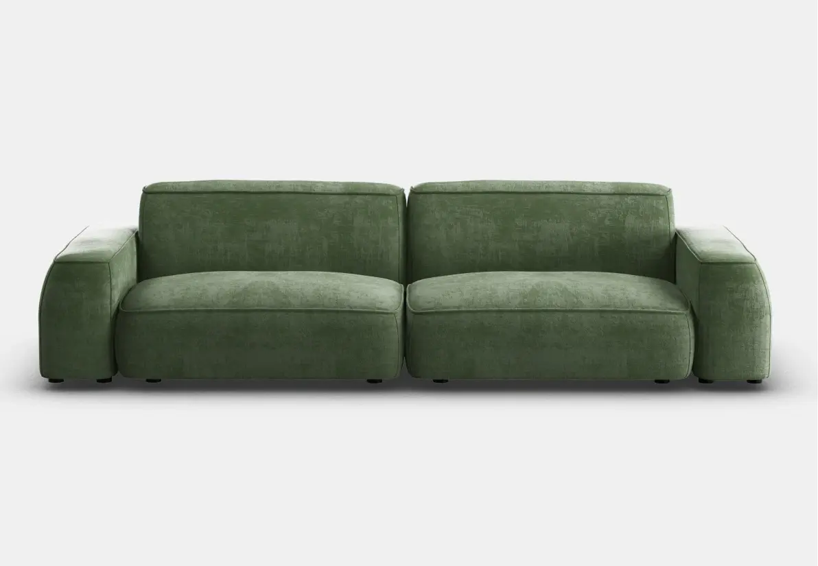 Элегантный двухместный диван с велюровой обивкой оливкового цвета и современными, мягкими формами