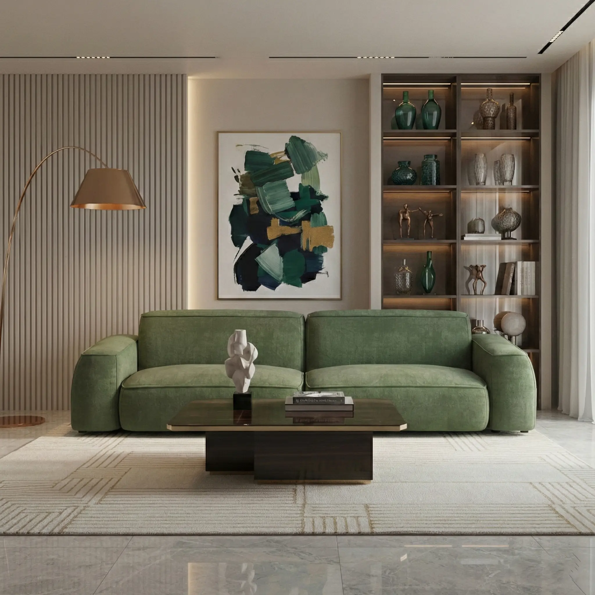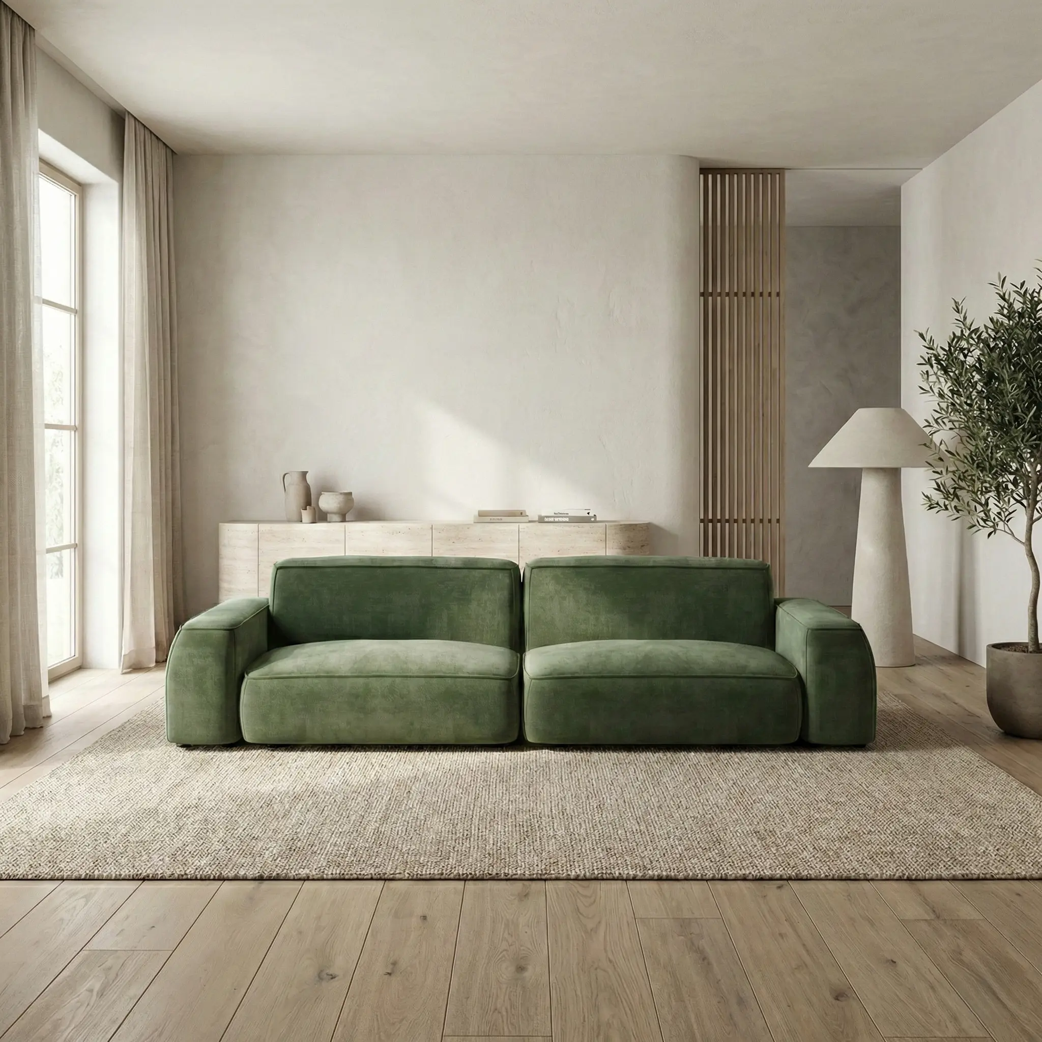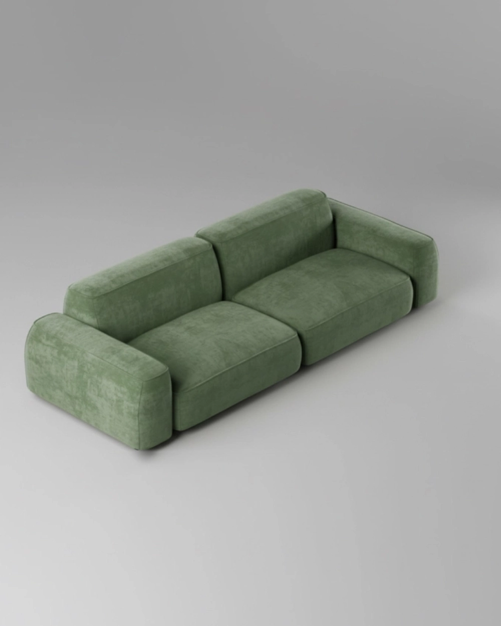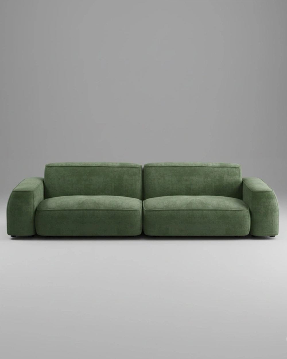 Элегантный двухместный диван с велюровой обивкой оливкового цвета и современными, мягкими формами