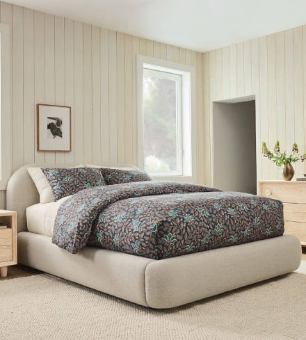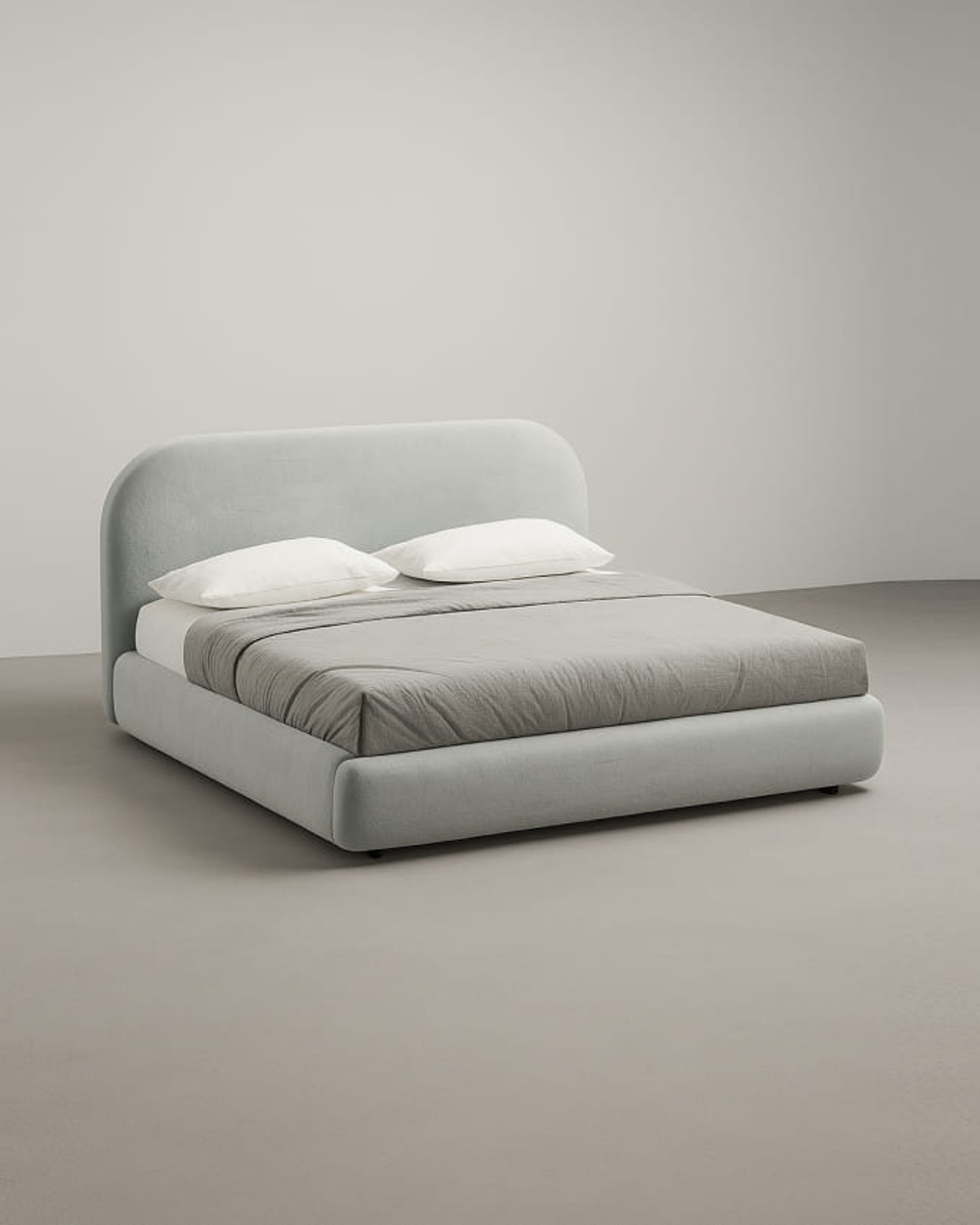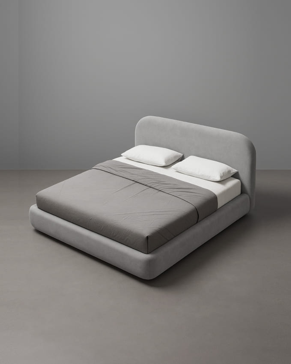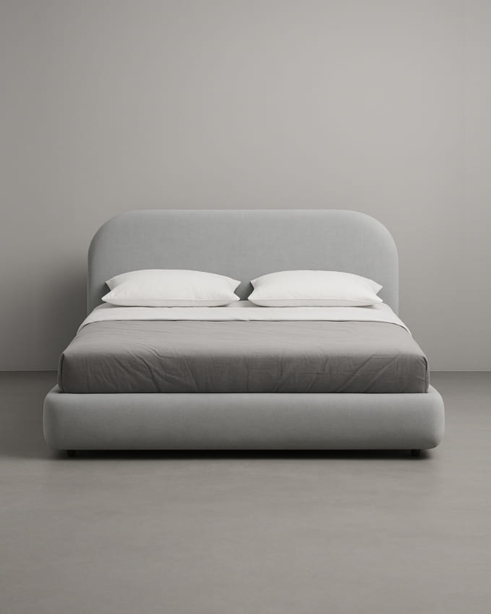 Кровать с плавно закругленным высоким изголовьем и объемным основанием, создающая мягкий и гармоничный силуэт