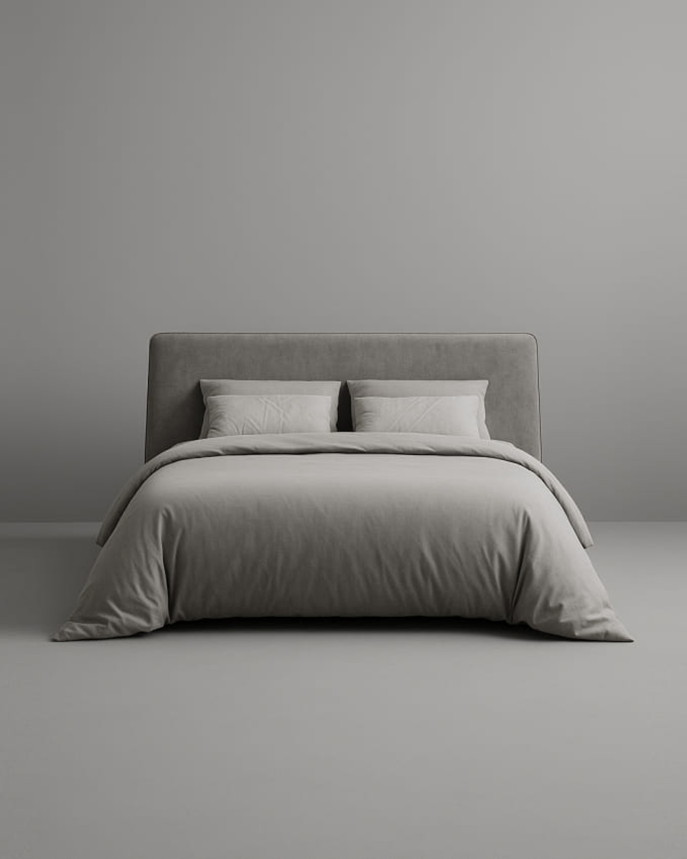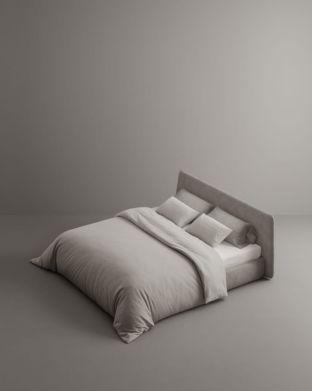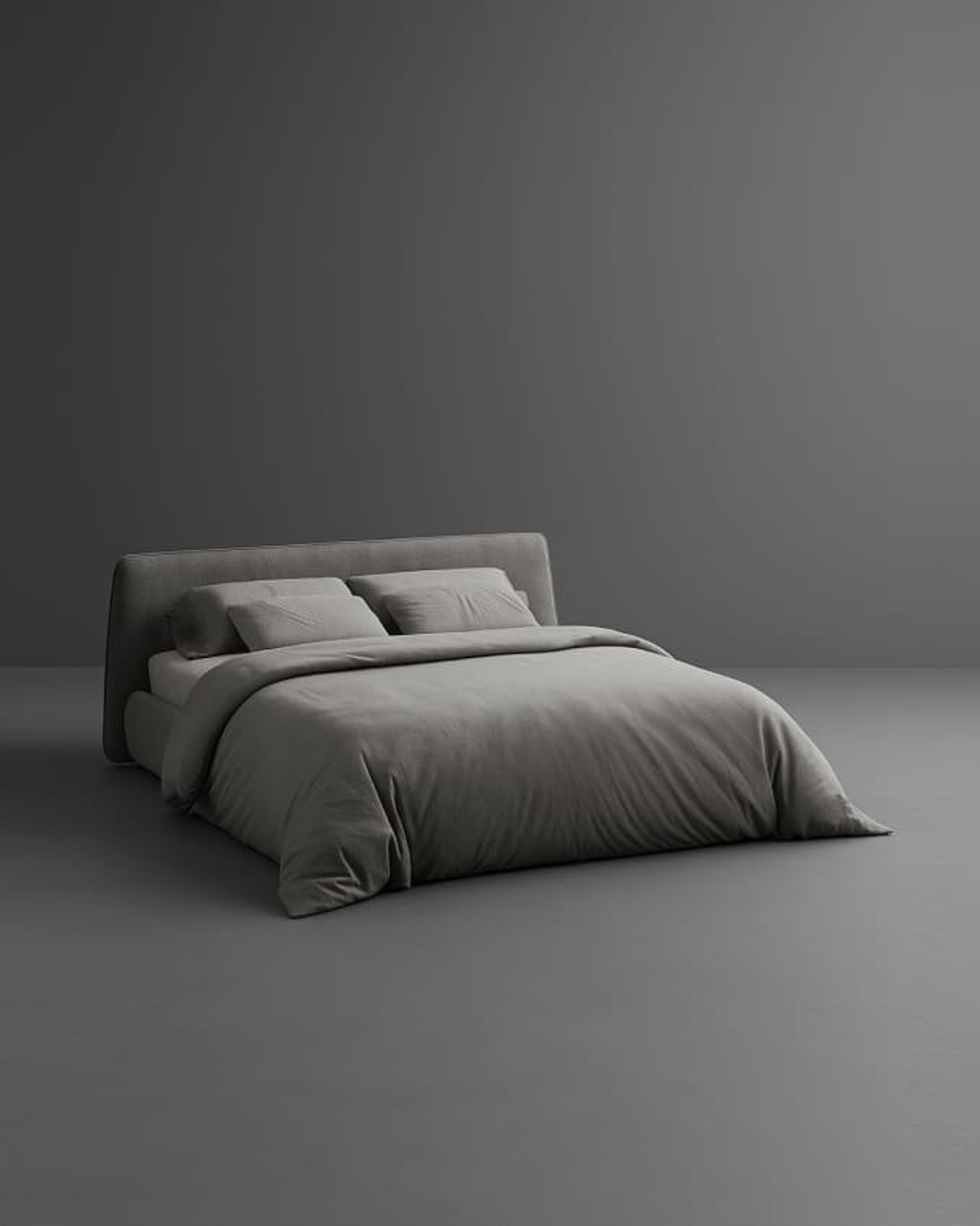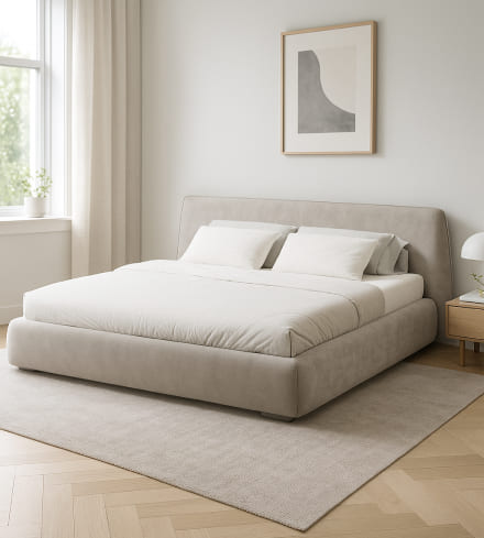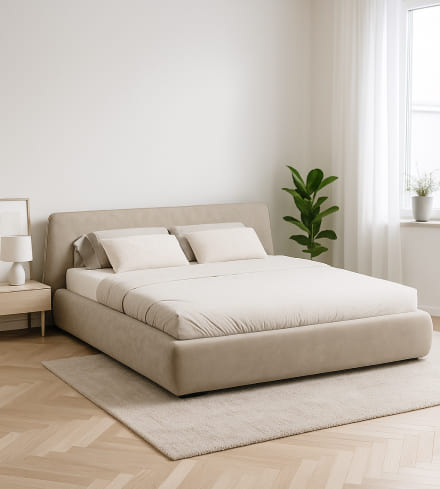 Кровать с широким цельным изголовьем и объемным мягким основанием, созданная в минималистичном современном стиле